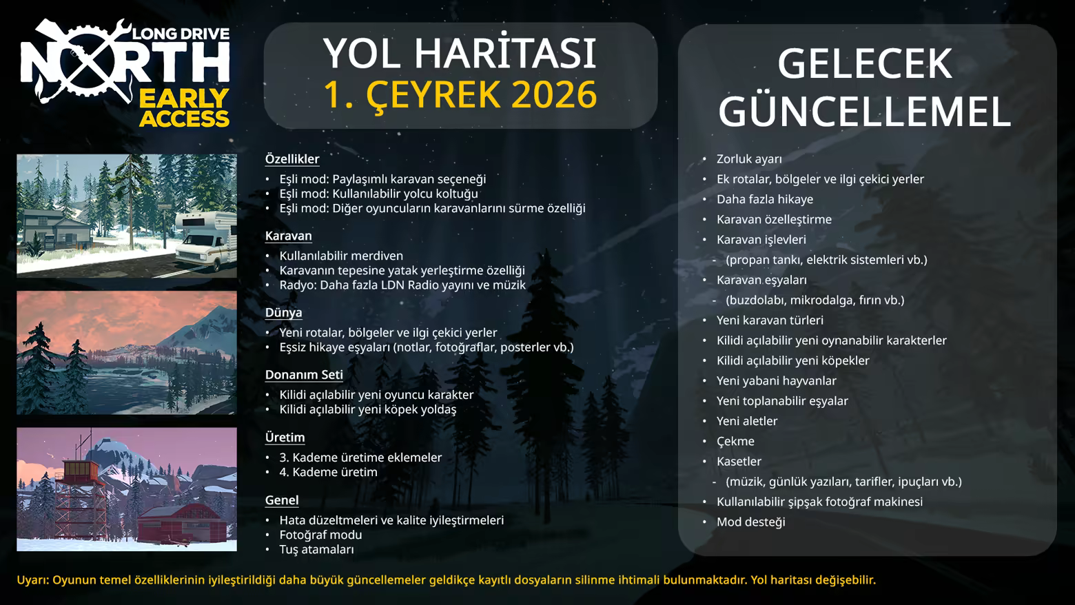 "Tam sürümü planlama aşamasındayız. Gelişmiş karavan bakımı/tamiri ve hayatta kalma sistemleri gibi özellikler eklemeyi planlıyoruz. Ayrıca avlanacak daha çok yabani hayvan ve pişirilecek daha çok yemek tarifi de planlarımız arasında. Bunlara ek olarak Erken Erişim süresince iyileştirmeler ve optimizasyonlar yapmayı hedefliyoruz. Daha da önemlisi topluluğumuzun geri bildirimlerinin ve görüşlerinin de Long Drive North için güncelleme planlarımıza katkısı olacak."