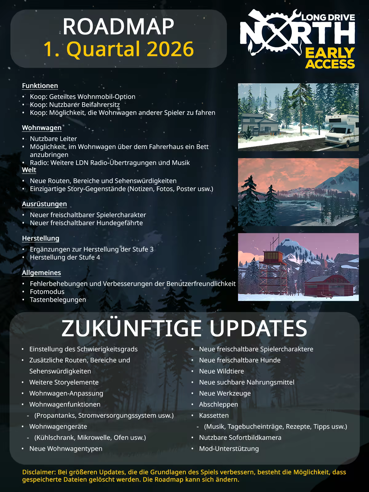 „Wir werden das komplette Spiel mit verbesserten Instandhaltungs- und Reparaturfunktionen für den Wohnwagen sowie einem verbesserten Überlebenssystem ausstatten. Außerdem haben wir vor, mehr Tiere zum Jagen und zusätzliche Kochrezepte hinzuzufügen. Des Weiteren ist vorgesehen, während des Early Access weiter am Feinschliff und an der Optimierung des Spiels zu arbeiten. Dabei spielen das Feedback und die Vorschläge unserer Community eine essenzielle Rolle und werden in unsere Update-Planung für Long Drive North einbezogen.“