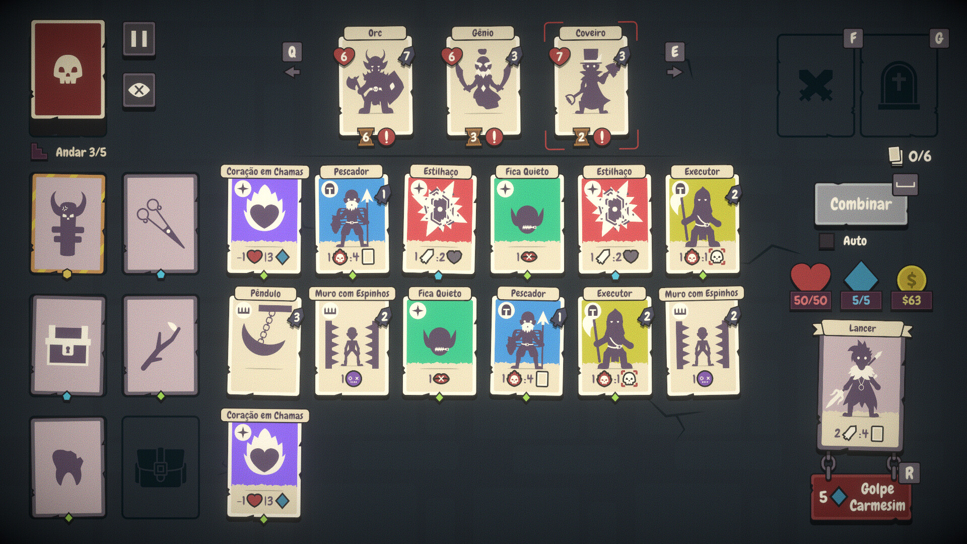 Cada partida é diferente. Os inimigos são aleatórios, assim como as relíquias e os consumíveis. Você nunca sabe o que encontrará na próxima sala.