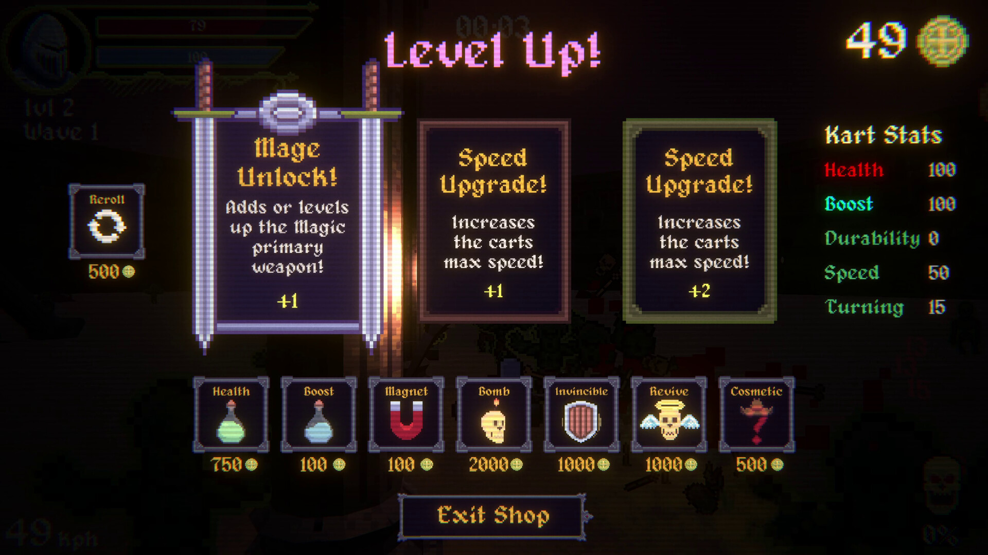 Live long enough to play the bonus round at the end of each stage and enjoy a classic kart race with the local foes! Put them in their place, preferably while staying in 1st, and earn even more Gold and Soul Shards, the currencies used for unlocking new weapons, sub-weapons, and upgrading your kart stats!