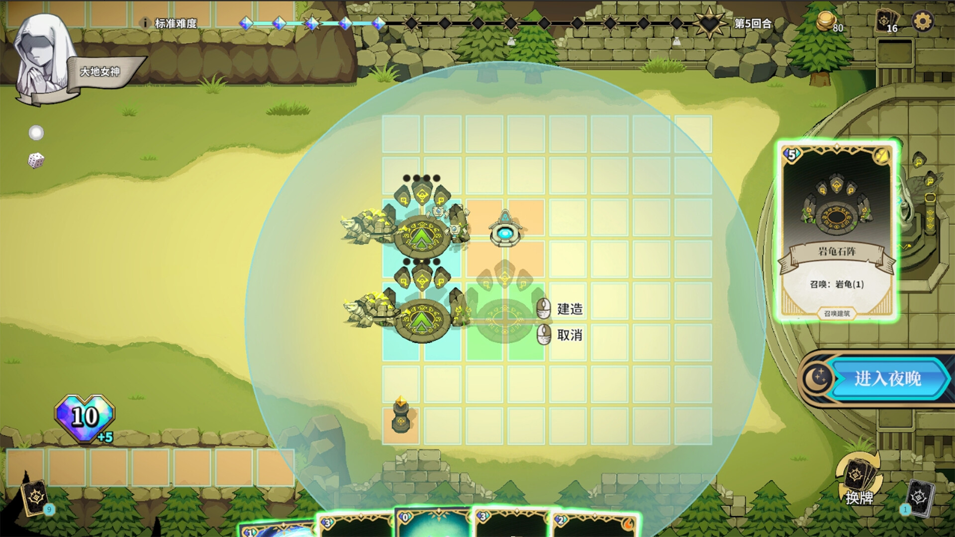 使用卡牌放置或强化建筑、施展魔法,自由构筑专属卡组,打造独特的防御策略。