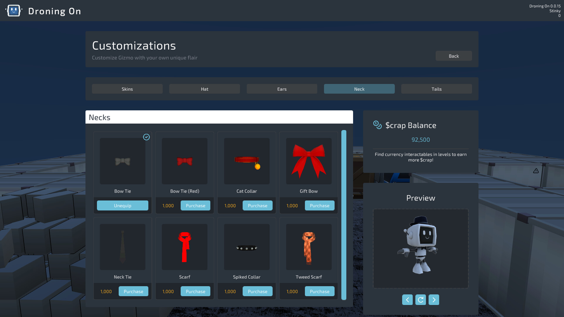 Make Gizmo yours. Earn $crap as you play and unlock a growing wardrobe of cosmetic skins and accessories. Mix and match Hats/Ears, Neckwear, Tails, and Skins to create your perfect robo-fit. All items are purely cosmetic and compatible across Bootcamp, Puzzle, and Endurance modes.