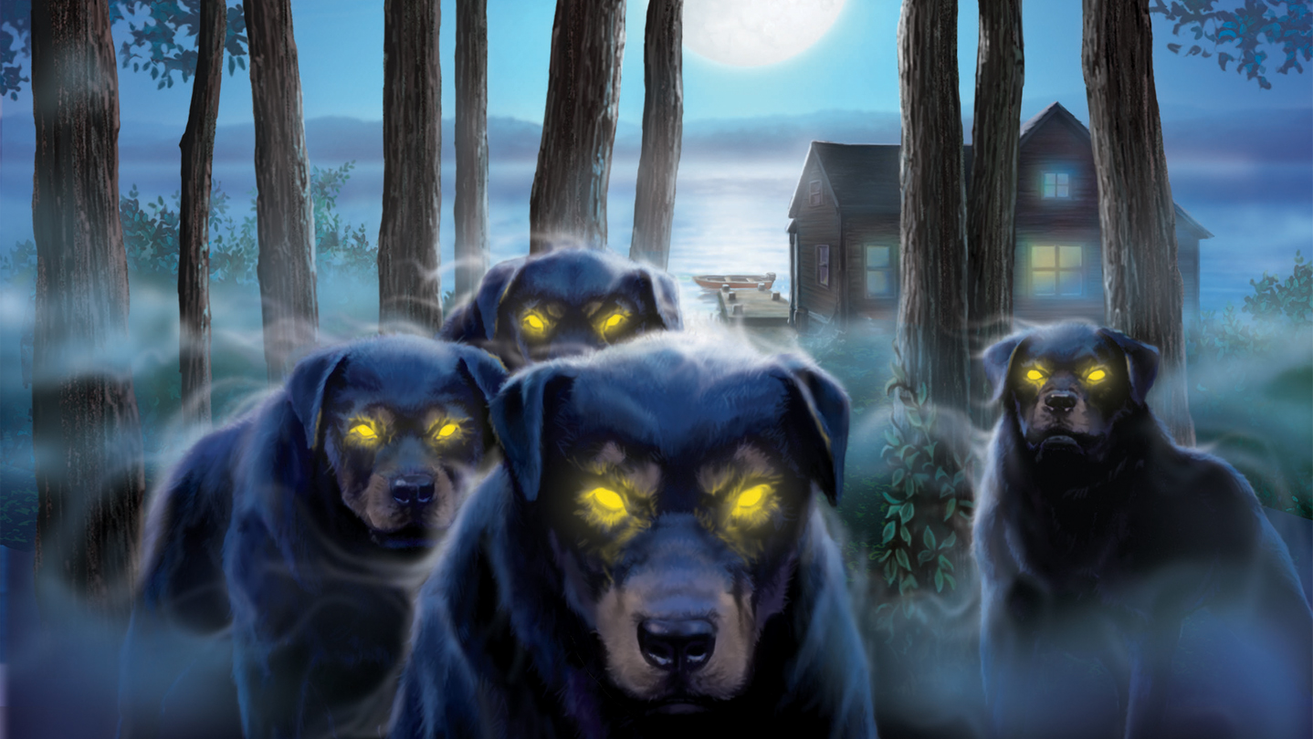 Dare to play this spooky game and unravel an old prohibition-era plot at a cabin cursed by four haunting hounds with seemingly supernaturally glowing eyes. Gather clues in the moonlit forest setting and discover a ghostly graveyard, hidden dark tunnels, and a sinister scheme.