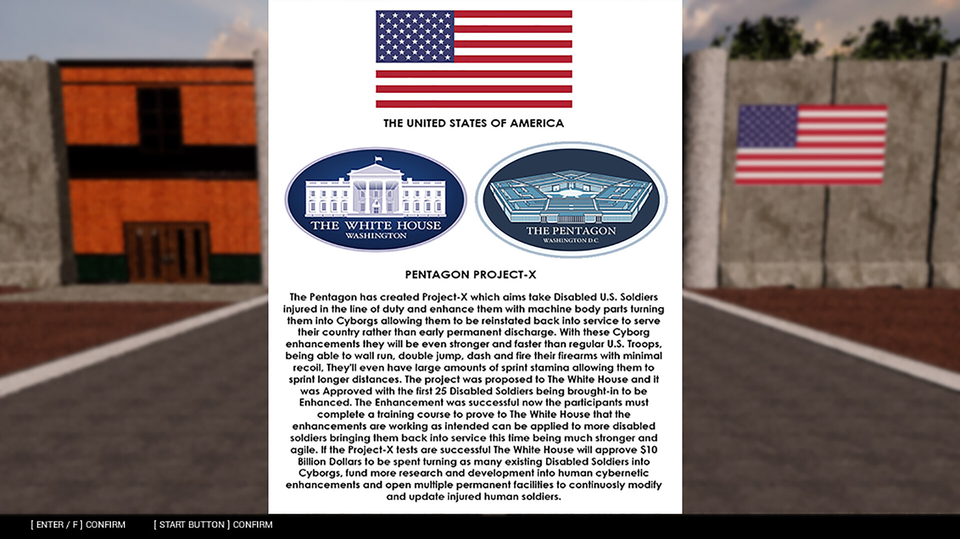 Nathan Kennedy (34) a U.S. Army Corporal critically injured during a U.S. Special Operation in Afghanistan has been operated and turned into a Cyborg by The Pentagon in a New Cyborg Super Soldier Project Partially authorized by The White House called Project-X, which aims to turn disabled U.S. soldiers into Cyborgs possessing increased physical strength, jump height and movement speed than the average U.S. soldier having abilities like wall running, double jump, dash and high gun precision. Nathan Kennedy( YOU ) are one of the disabled soldiers selected by The Pentagon to undergo the procedure. You have completed your transformation and must prove to your GENERALS that you can complete a military course built in the Nevada Desert which will then prove to The White House that the enhancements are a success and that Project-X can be fully authorized to go into full-scale adoptation by the U.S. Military turning more Disable Soldiers into Strong Powerful Cyborgs that will give the U.S. an edge over RUSSIA, CHINA, IRAN, NORTH KOREA in Military operations. That these Cyborgs are strong, powerful and can be reinstated back in the army to serve along side other members being much faster and stronger than their counterparts.