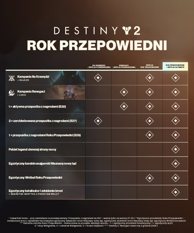 Zapraszamy na cały rok przygód i eksploracji w edycji Destiny 2: Rok Przepowiedni zawierającej dwa dodatki – Destiny 2: Na Krawędzi i Destiny 2: Renegaci – oraz początek nowej sagi w Destiny.