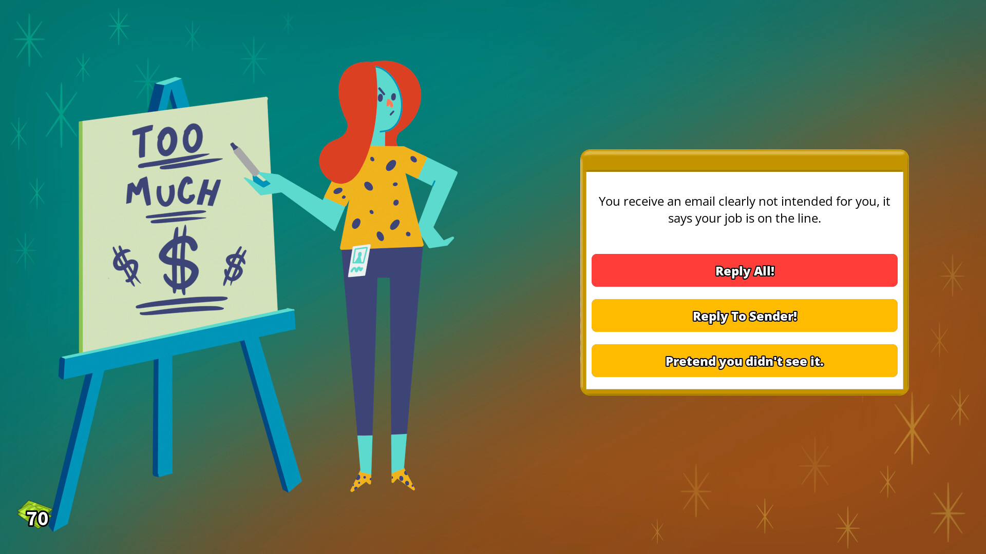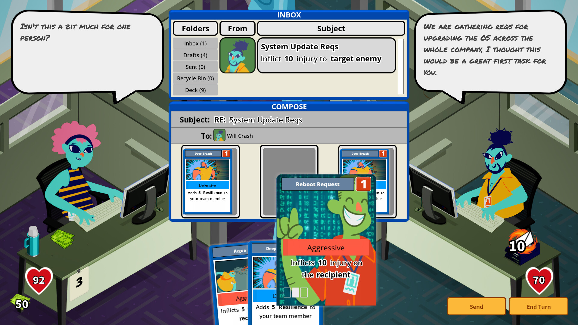 Reply All is a 2D Single-player Roguelike deck builder, where email is turn-based combat. You play as an intrepid employee taking on the hordes of middle managers and office suits in your journey to climb the corporate ladder.