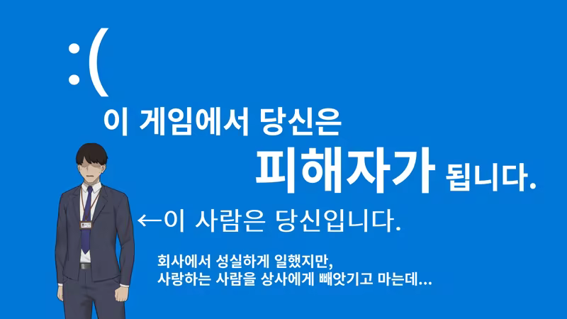당신은 블랙기업 제약회사에서 착취당하는 직원입니다. 당신의 상사이자 연인인 그녀는, 당신이 보스에게 괴롭힘을 당할 때마다, 항상 당신의 편에서 당신을 지지하고 응원해 주었습니다. 하지만 사실 당신의 보스도 당신의 애인에게 관심이 많으며, 당신과 그녀 사이를 갈라놓을 기회를 항상 엿보고 있었습니다.