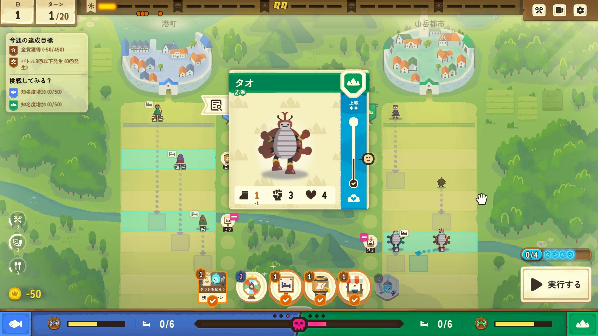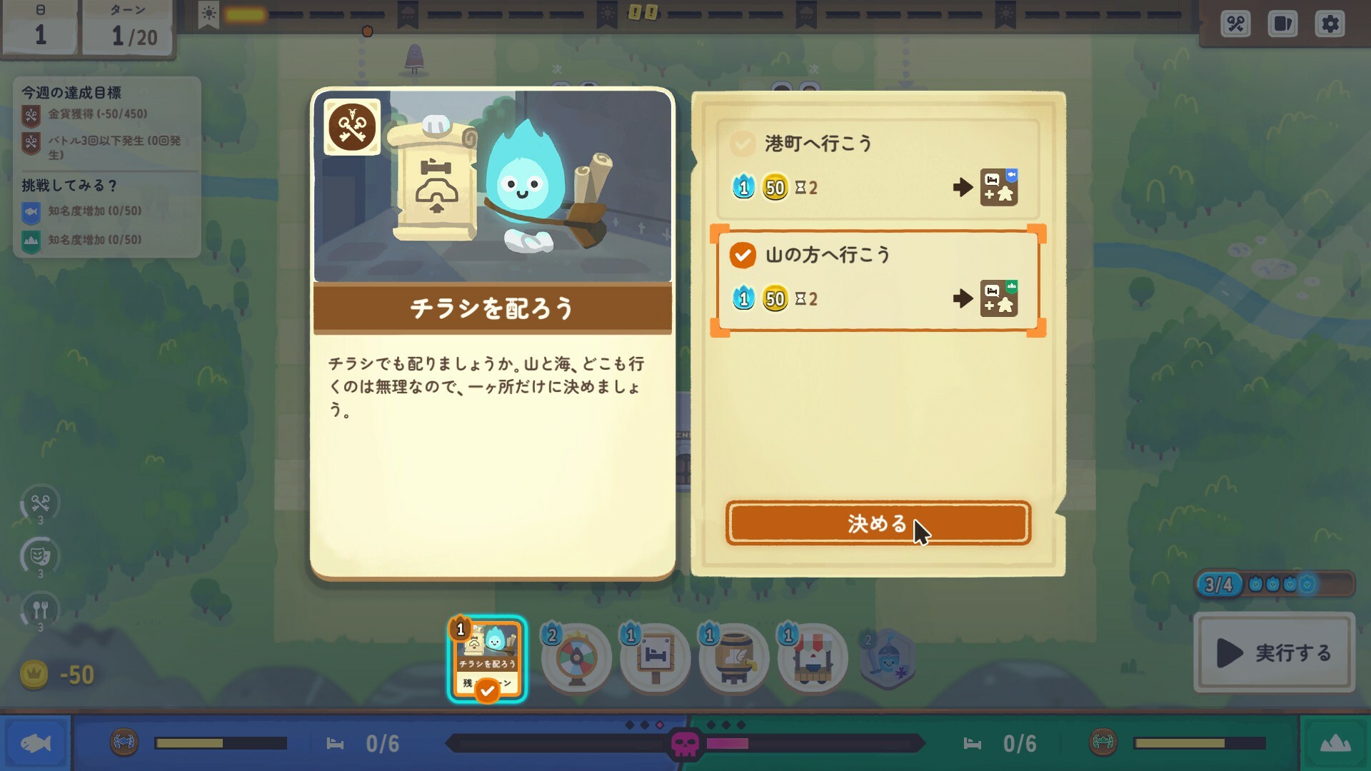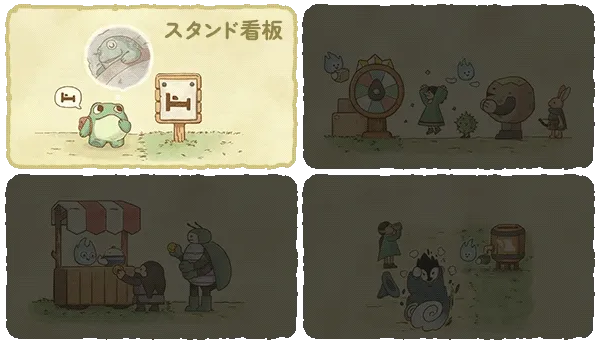 寄ってらっしゃい、見てらっしゃい!お宿にもっと客を呼び込むために、スタンド看板を設置したり、屋台を出したり、栄養ドリンクやルーレットなどで冒険者の心を掴もう。ただそれも全てタイミングを見計らってやること。両ギルドの冒険者たちがお宿の前で鉢合わせになる状況だけは避けたい。たまには、その場で1ターン休ませるのも、悪くない策略なのかも。