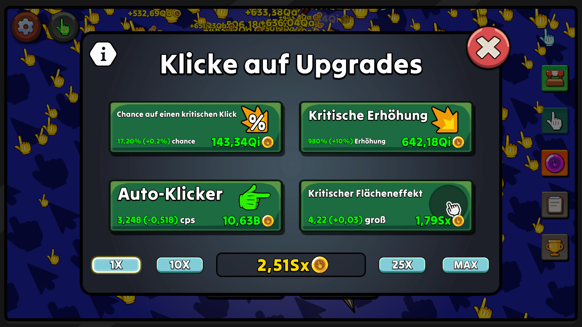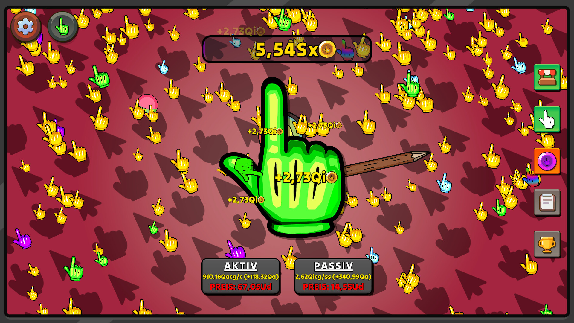Wenn Sie auf den Hauptcursor klicken, werden goldene fallende Cursor erscheinen. Ihre Erscheinungsrate basiert auf dem Fortschritt, den Sie durch Klicken machen. Wenn Sie auf diese fallenden Cursor klicken, werden Sie mit Klickgold belohnt, das mehr ist als das Klickgold, das Sie durch aktives Klicken erhalten.