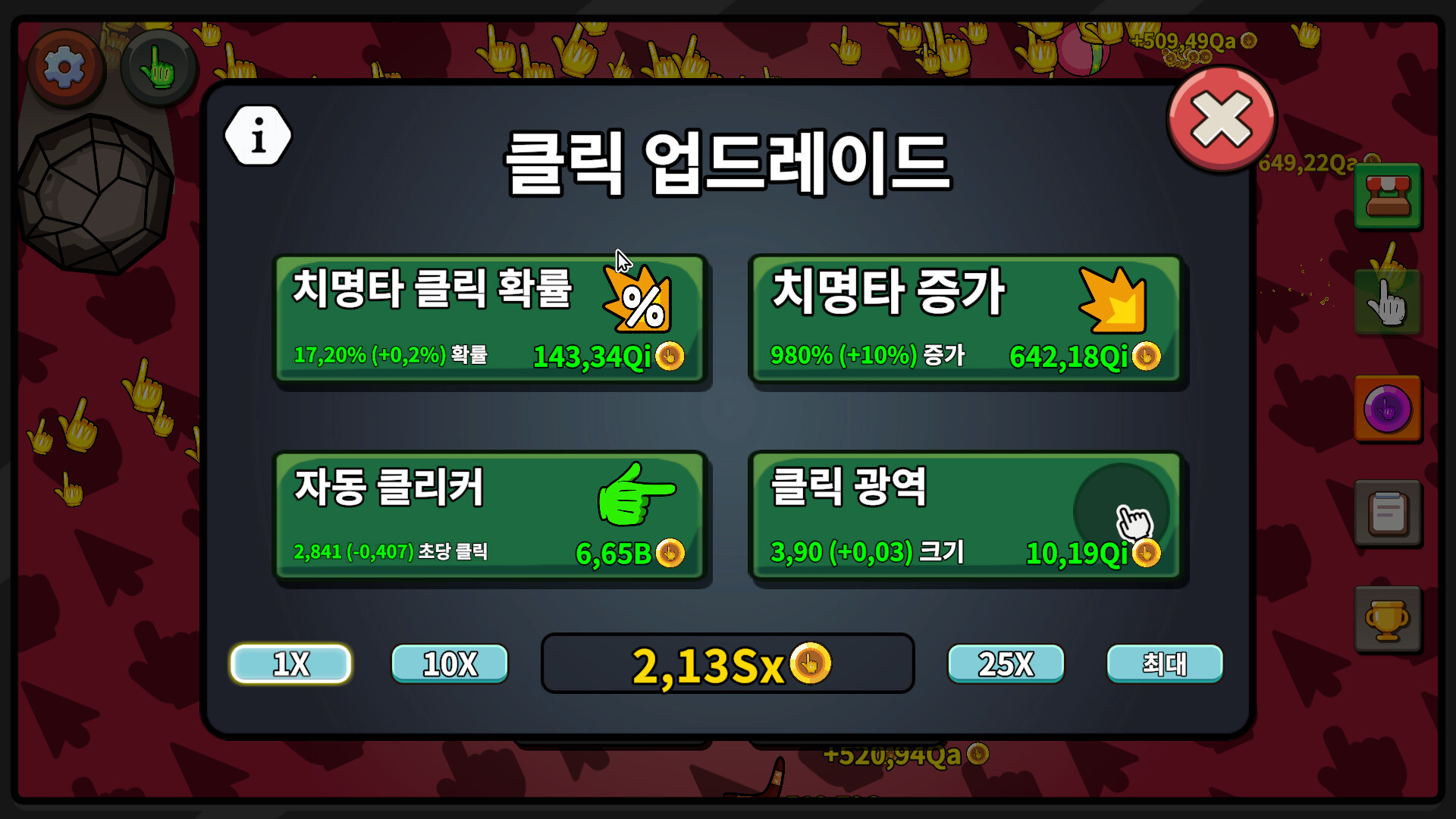영구 업그레이드를 구매하는데 사용하는 클릭센션 코인을 획득하기 위해 게임을 초기화 및 상승해 보십시오. 클릭센션 업그레이드는 끝이 없기 때문에, 원하는 만큼 게임을 계속해서 진행할 수 있게 합니다.