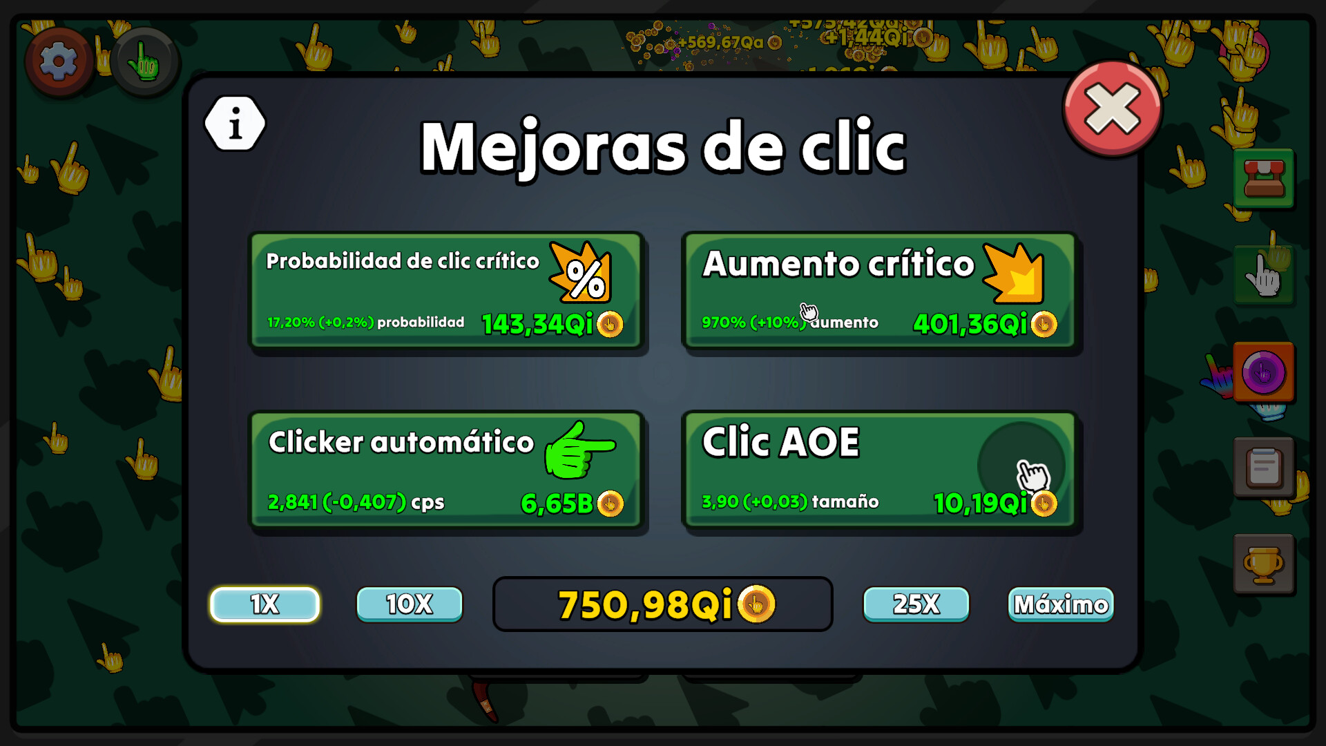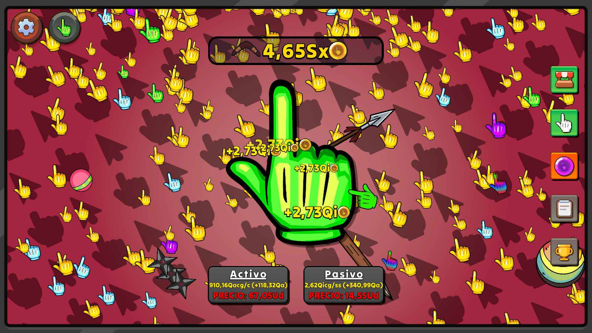 A medida que haces clic en el cursor principal, comenzarán a aparecer cursores dorados que caen. Su tasa de aparición depende del progreso que hagas clicando. Al hacer clic en estos cursores que caen, recibirás oro por clic, y este oro será mayor que el que obtienes por hacer clic activo.