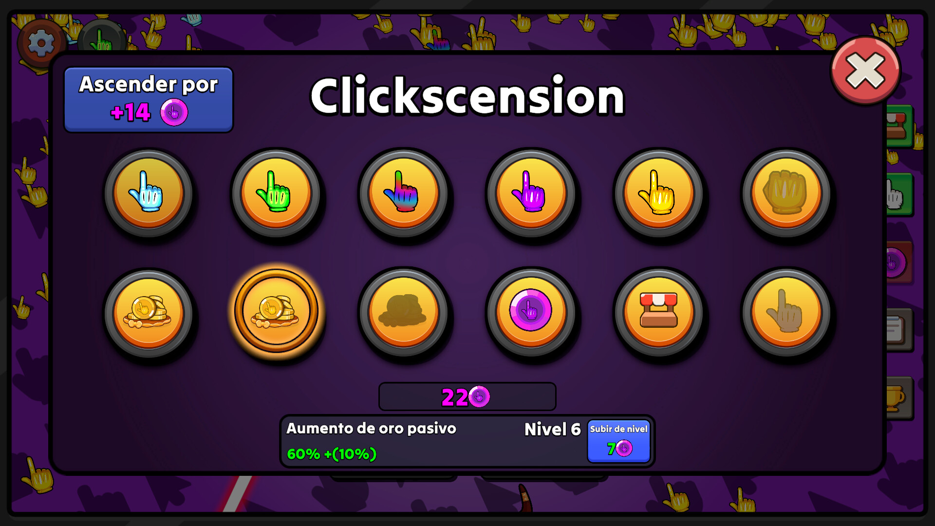 ¡Asciende y reinicia el juego para recibir monedas de clickscension, que puedes usar para comprar mejoras permanentes! Estas mejoras de clickscension no tienen fin, lo que significa que puedes seguir jugando y progresando tanto como quieras.