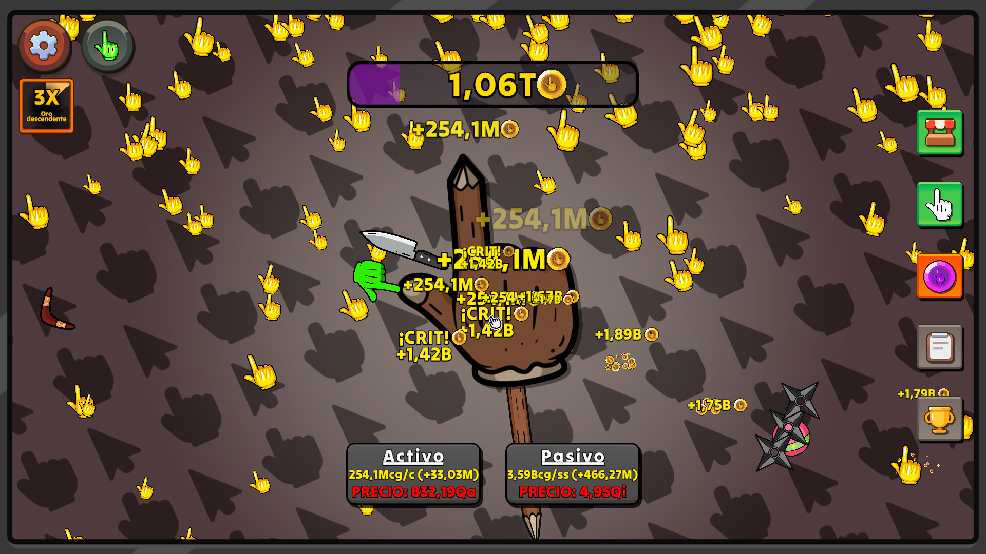 A medida que haces clic en el cursor principal, comenzarán a aparecer cursores dorados que caen. Su tasa de aparición depende del progreso que hagas clicando. Al hacer clic en estos cursores que caen, recibirás oro por clic, y este oro será mayor que el que obtienes por hacer clic activo.
