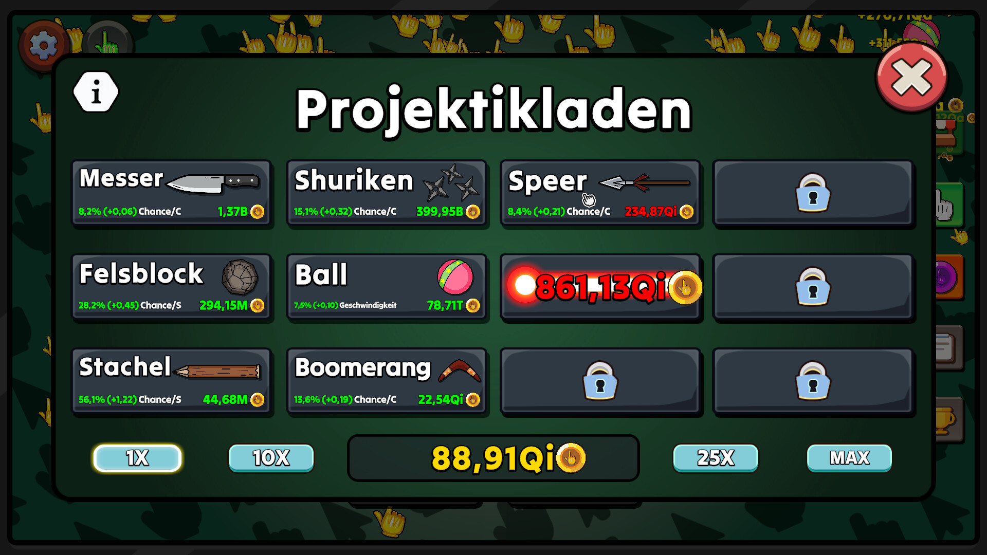 Wenn Sie auf den Hauptcursor klicken, werden goldene fallende Cursor erscheinen. Ihre Erscheinungsrate basiert auf dem Fortschritt, den Sie durch Klicken machen. Wenn Sie auf diese fallenden Cursor klicken, werden Sie mit Klickgold belohnt, das mehr ist als das Klickgold, das Sie durch aktives Klicken erhalten.