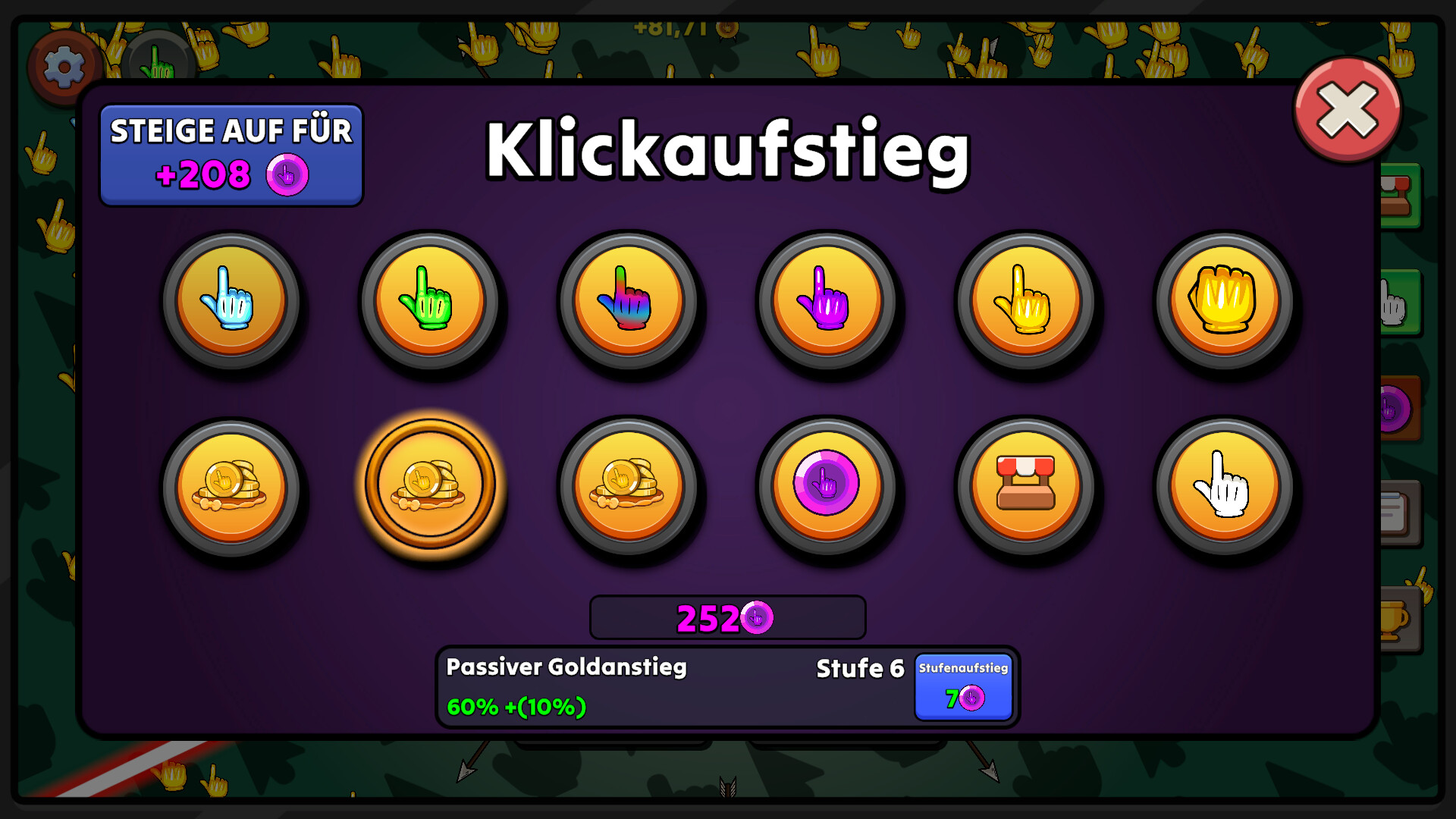 Steigen Sie auf und starten Sie das Spiel neu, um Clickscension-Münzen zu erhalten, mit denen Sie permanente Upgrades kaufen können. Diese Clickscension-Upgrades haben kein Ende, was bedeutet, dass Sie weiterspielen und so lange Fortschritte machen können, wie Sie möchten!