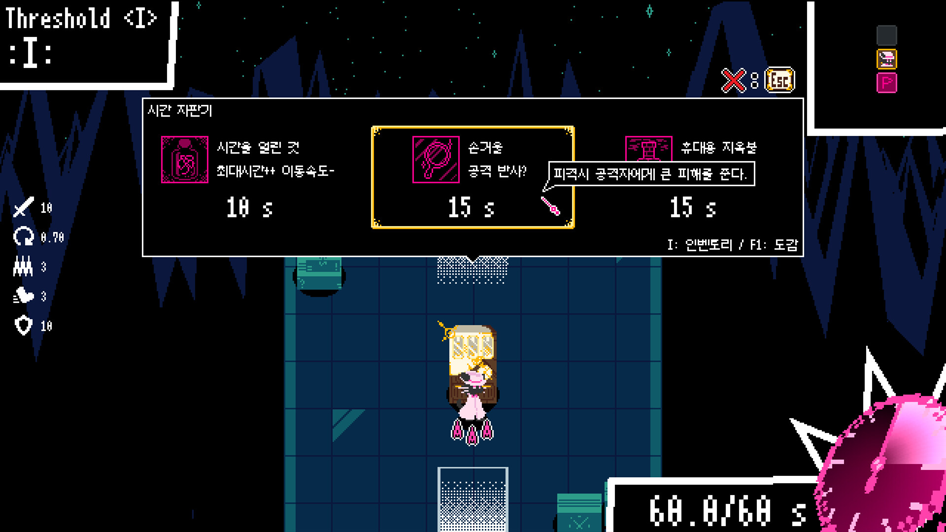 체력, 시간 정지 사용, 아이템 구매 등 유일한 자원인 시간을 전략적으로 관리하고,