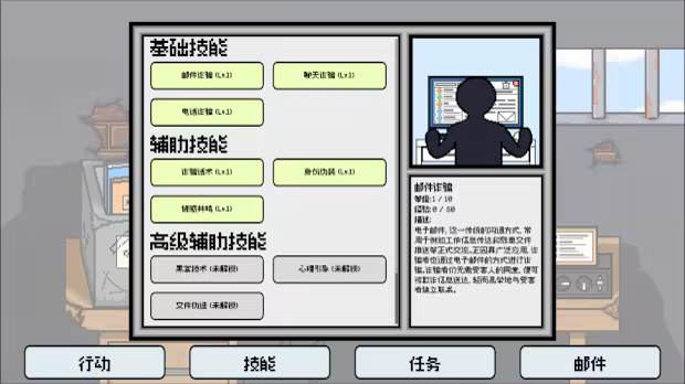 玩家擁有多種詐騙技能,升級現有技能並解鎖更多詐騙技能,可以幫助玩家詐騙更多的受害人,提高詐騙成功率和獎勵,還能降低詐騙小遊戲的難度。
