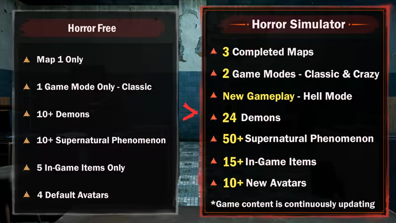 Horror Simulator VR 전체 게임을 구매하면 더 많은 맵과 콘텐츠를 잠금 해제하여 두 배의 재미를 누릴 수 있습니다!