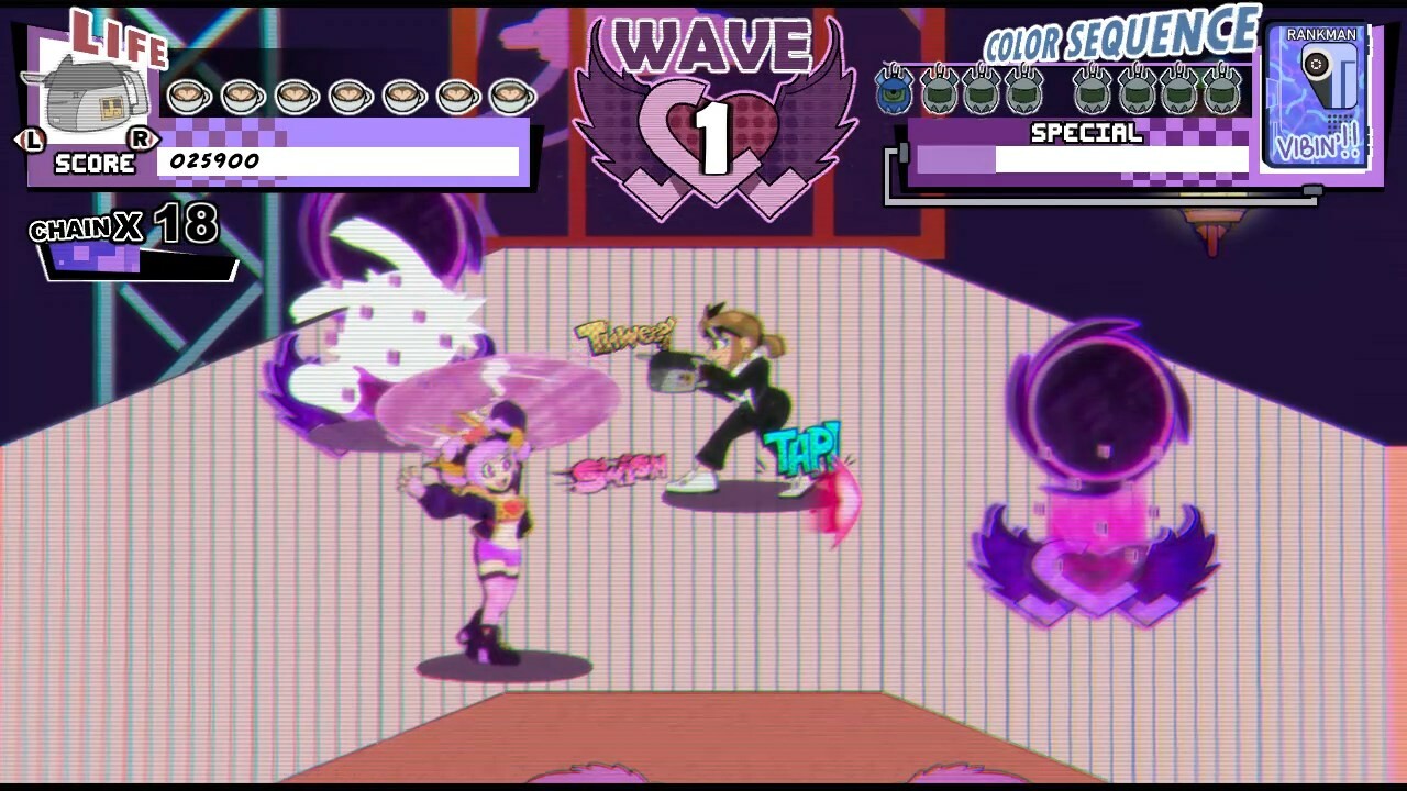 Use your coffee blaster to hit enemies with the matching color to keep the rhythm alive.