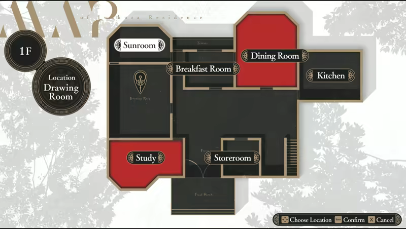 Use the map to explore different rooms of the mansion to piece together key information needed to uncover characters' hidden secrets and the greater secrets at play.