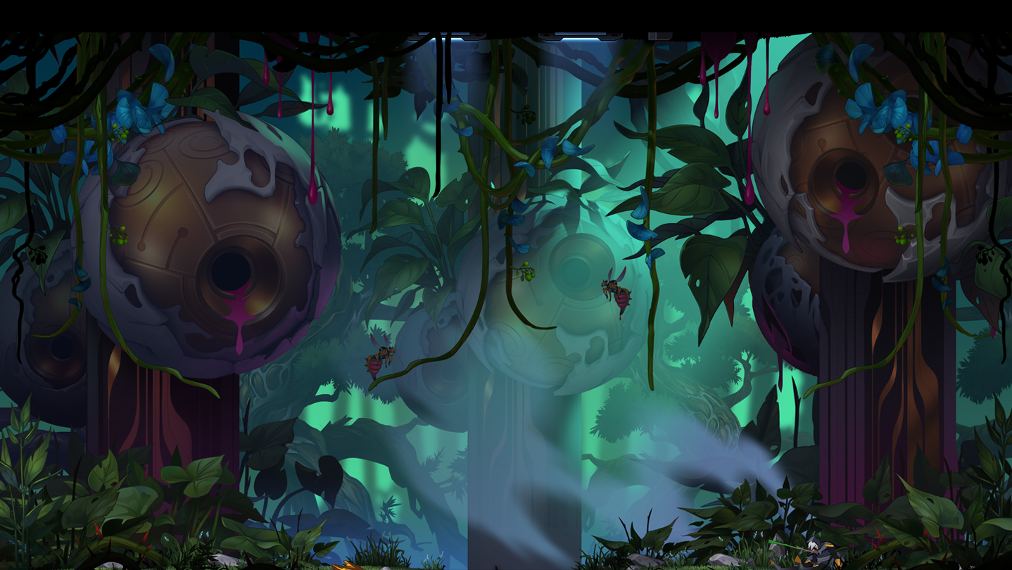 Explore a vast 2D world with diverse biomes, each harboring secrets. Use Inayah's movement abilities and her drone companion, Sputnik, to uncover hidden paths and treasures.