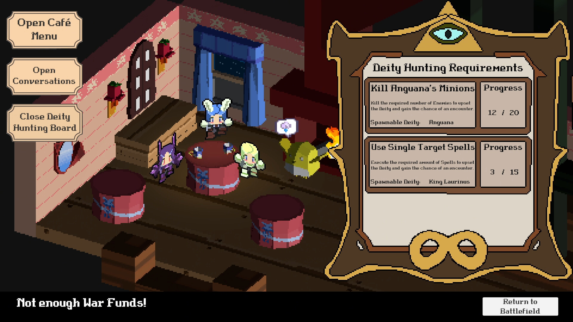 Align with or against powerful Deities based on your actions and their caprices. Satisfy special requirements to unlock a fateful battle with a Deity, elusive, powerful creatures granting benefits to whoever succeeds in subjugating them.