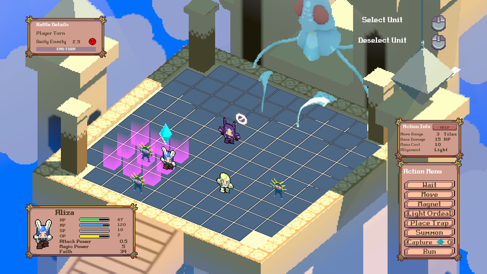 Fight the mysterious Godlings and their Leaders, moving each of the Saints across a dynamic grid-based battlefield. Use your wits to position your Units carefully and outsmart the enemy by leveraging on each of your party member's specialities.