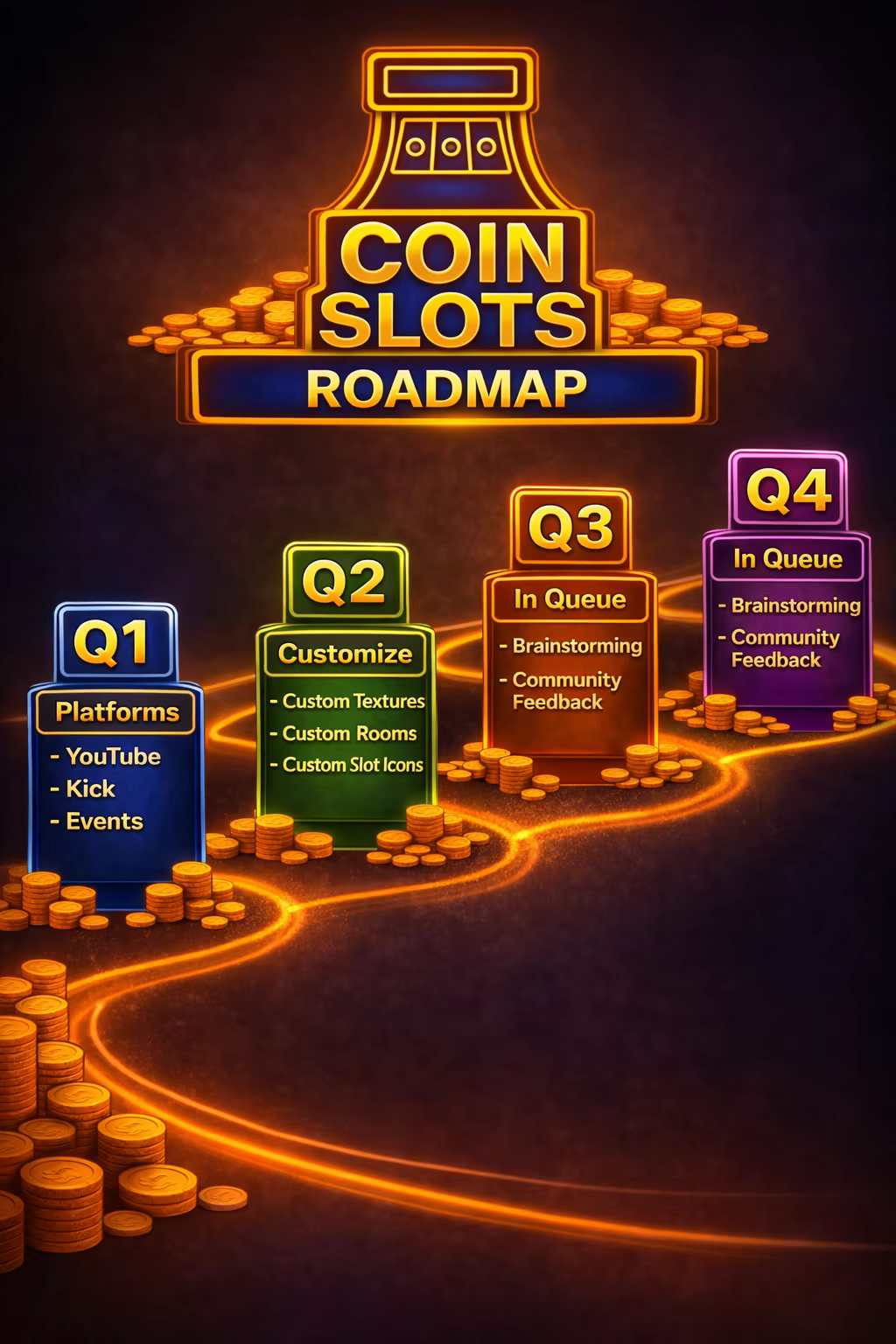 Coin Slots Live is focused on creating entertaining, community driven moments on stream, with ongoing development aimed at expanding features, customization, and progression. No real world gambling is involved.