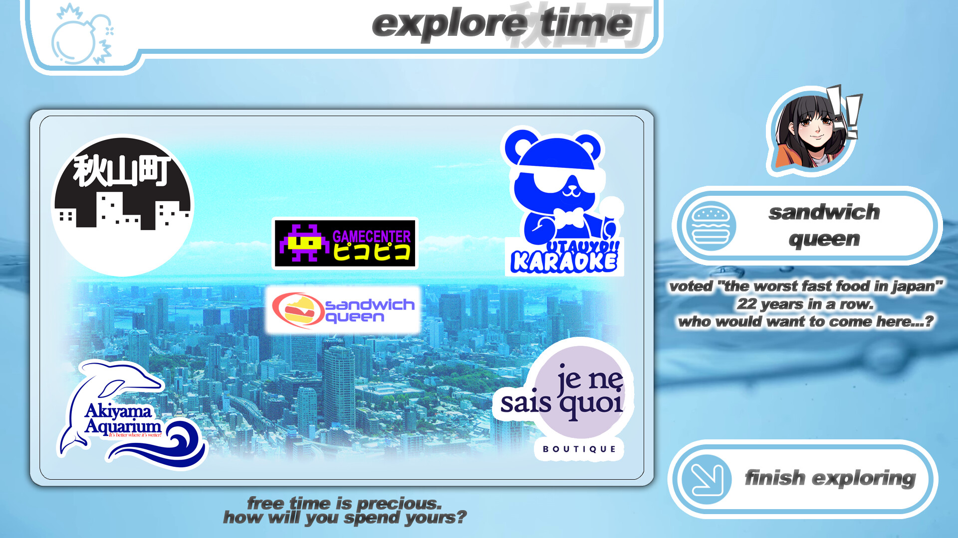 Explore Akiyama! See what's going on across town throughout each girl's story! With the variety of locations being different per route, there's no shortage of things to see and girls to bump into!