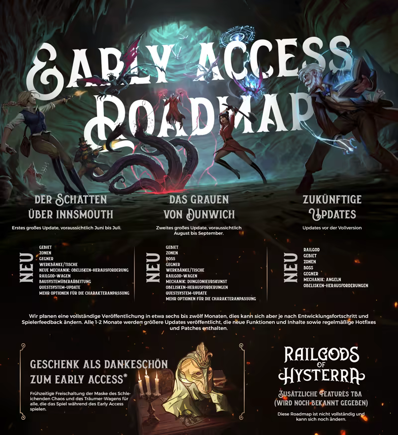 „Wir glauben, dass RailGods of Hysterra das Potential hat, ein wirklich einzigartiges Survival-Aufbau-Erlebnis zu bieten, das Lovecraft‘schen Horror, prozedurale Erkundung und kooperativen Mehrspielermodus miteinander verbindet. Early Access gibt uns die Möglichkeit, das Spiel auf der Grundlage des Feedbacks der Spieler zu verbessern und zu erweitern, um sicherzustellen, dass sich jede Reise, jedes Opfer und jede Entscheidung bedeutungsvoll anfühlt. Durch die frühzeitige Einbeziehung der Community planen wir, Mechaniken zu verfeinern, die Fortschrittssysteme zu verbessern und neue Inhalte einzuführen, die die Vision des Spiels am besten unterstützen.“
