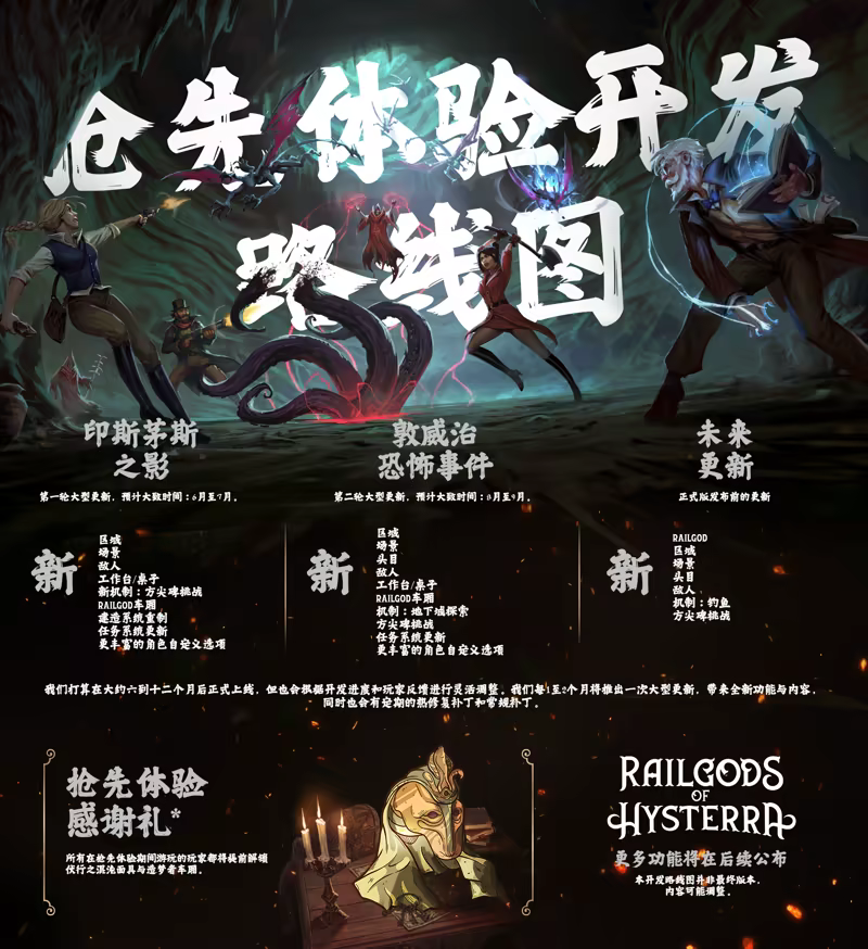 现在就加入《RailGods of Hysterra》的抢先体验之旅吧,每一个停车点、每一场战斗以及每一个选择都会影响你的生存几率。你的反馈会帮助我们打造出终极洛夫克拉夫特式的游戏,我们已经迫不及待要和你一起踏上这段旅程了!”