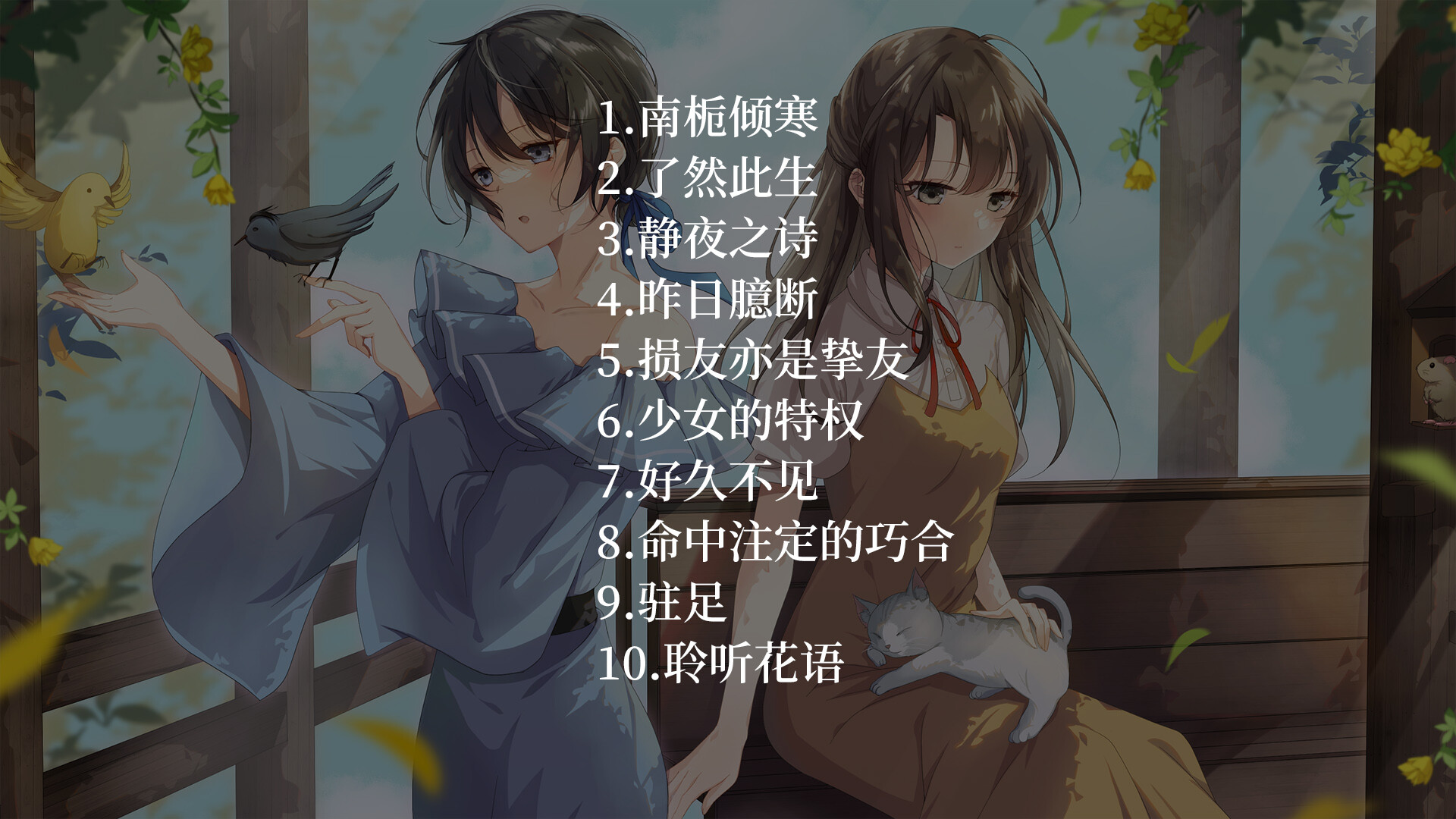 《南栀》原声音乐合集,一共包含10首新增曲目,不包含沿用自寄甡-Symbiotic Love 、千面-Melancholy Love 和 夜永-Eternal Love 中的原声音乐。