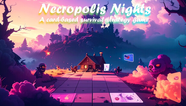 "Necropolis Nights" is a survival card game where you gather resources, craft, farm, and hunt by day, then fend off zombies at night. Strategize to survive and thrive in a world overrun by the undead.