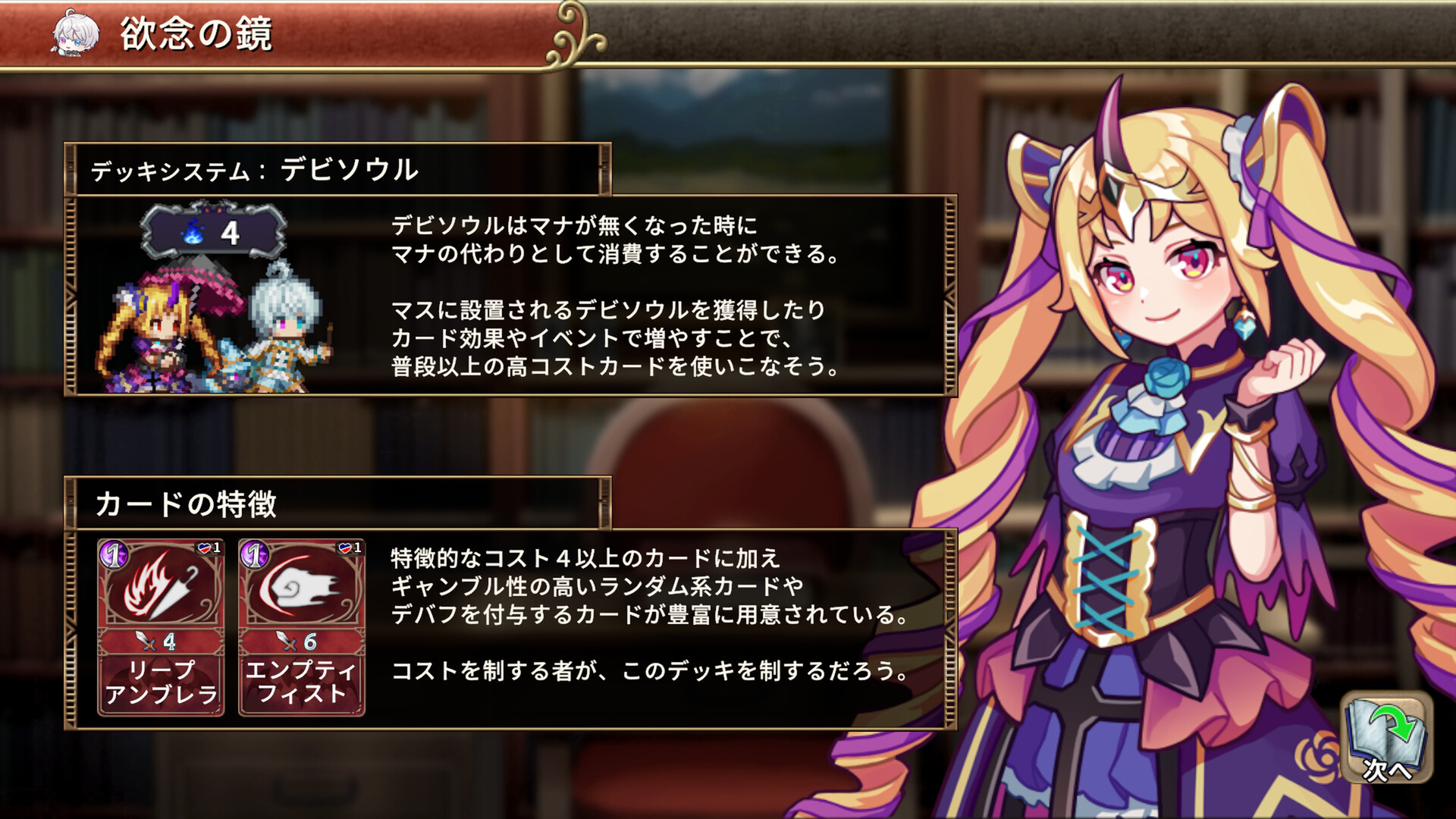 入るたびにリセットされるローグライク型のダンジョンで、敵を撃破しカードを選択することでオリジナルのデッキをビルドしよう。