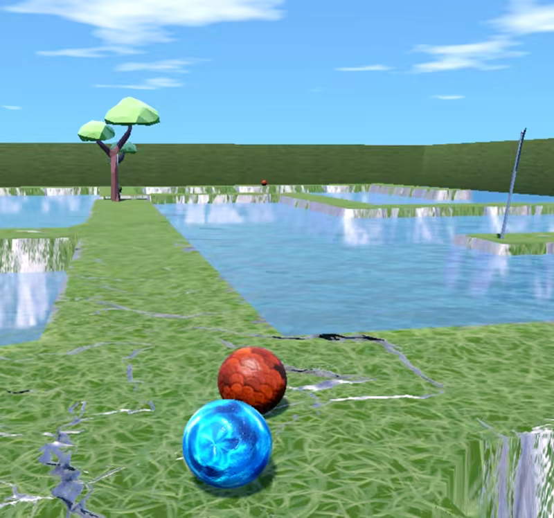 • Unfriendly red marbles want to kick you off the way into the water. Avoid any contact with them.