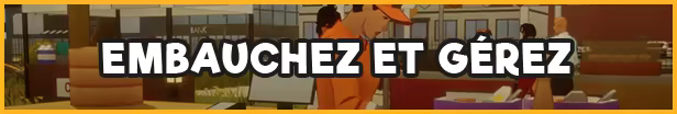 Engagez des cuisiniers pour préparer de délicieux plats, des nettoyeurs pour garder votre parc impeccable et des animateurs pour assurer l'ambiance. Vous pouvez également embaucher des managers pour gérer automatiquement vos stocks d'ingrédients. Chaque membre du personnel possède des compétences et une personnalité qui lui sont propres. Promouvez les employés pour augmenter leur efficacité au travail, mais aussi leur salaire.