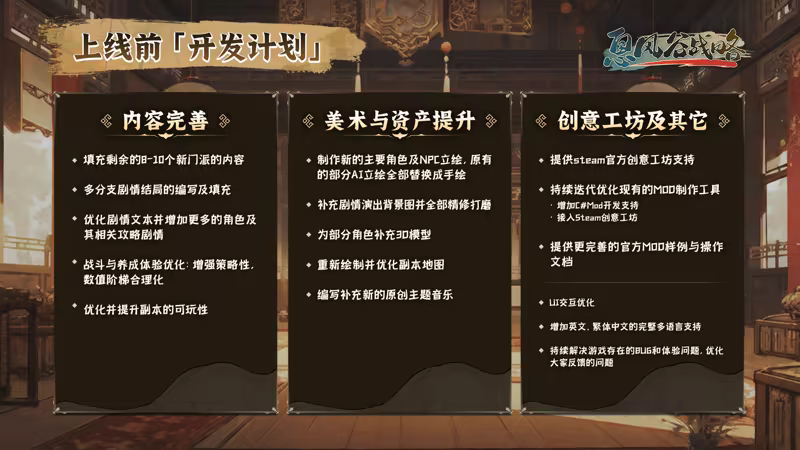 目前《息風谷戰略》的開發正處於全力衝刺階段,以下是遊戲在正式發售之前我們的開發及更新計劃,有請各位掌門過目。