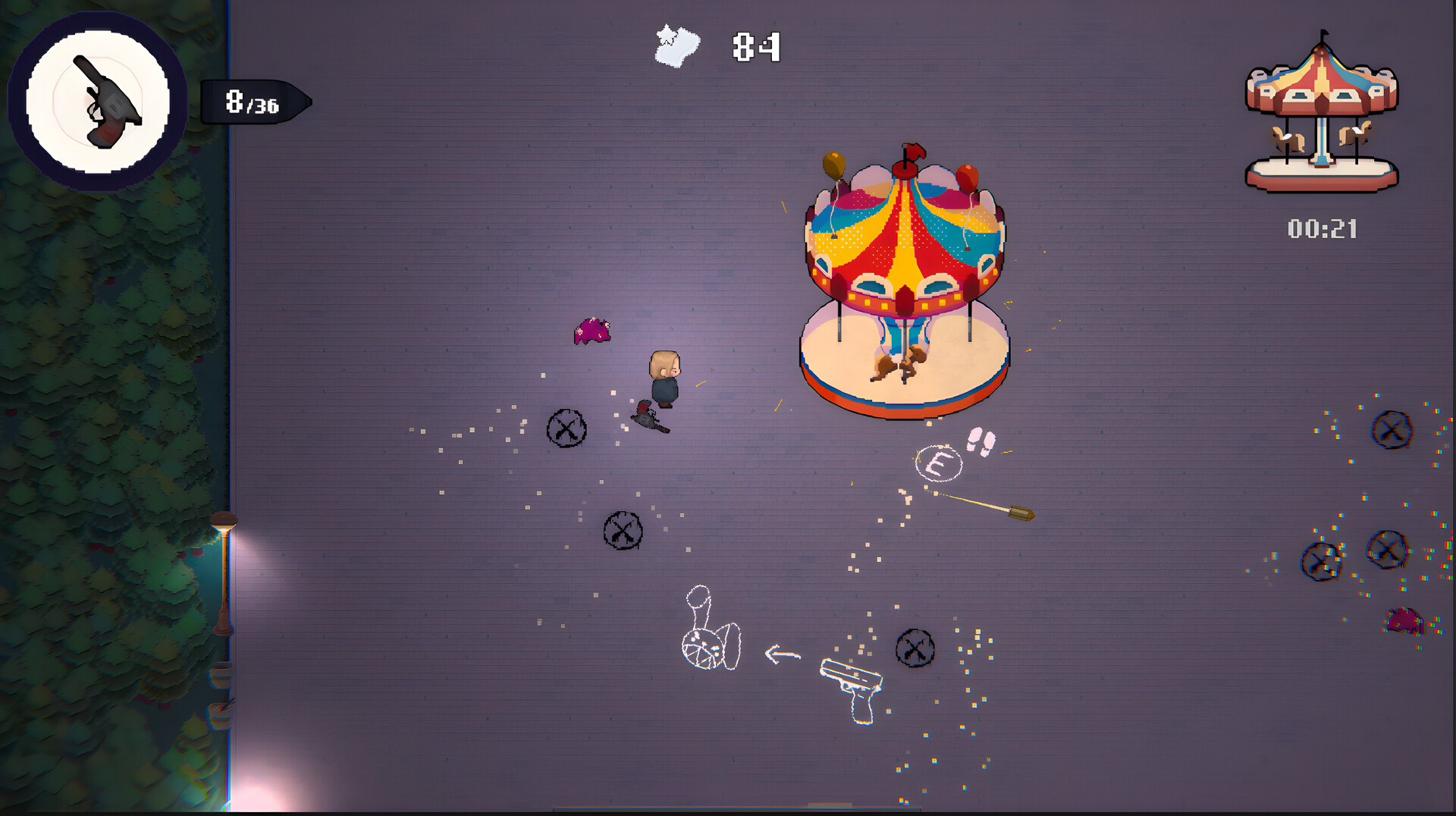 An arcade shooter in an amusement park: defeat enemies one wave after the other to keep the park clean of unwanted visitors. Unlock a variety of different weapons; upgrading them unlocks their special abilities. This is your first shift - will you be able to keep the park's rides safe?