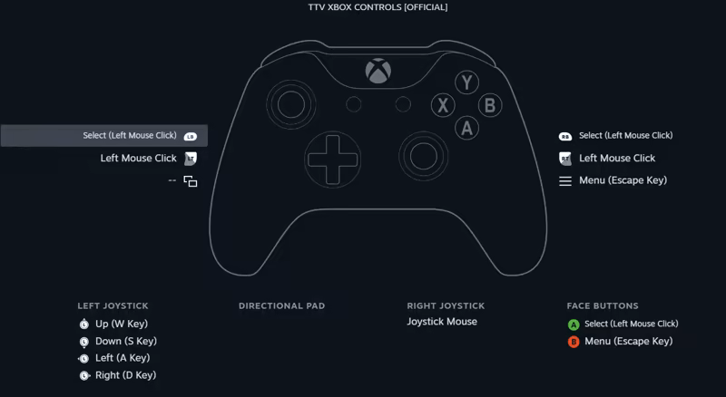 • Other gamepad controls (XBOX, PS5+gyro, SteamDeck) are supported using Steam Input's virtual controller configuration. Simply map at least one button for [Keyboard Escape] and [Mouse Left Click], and map the joysticks to [Keyboard WASD] or [Joystick Mouse]. Example below.
