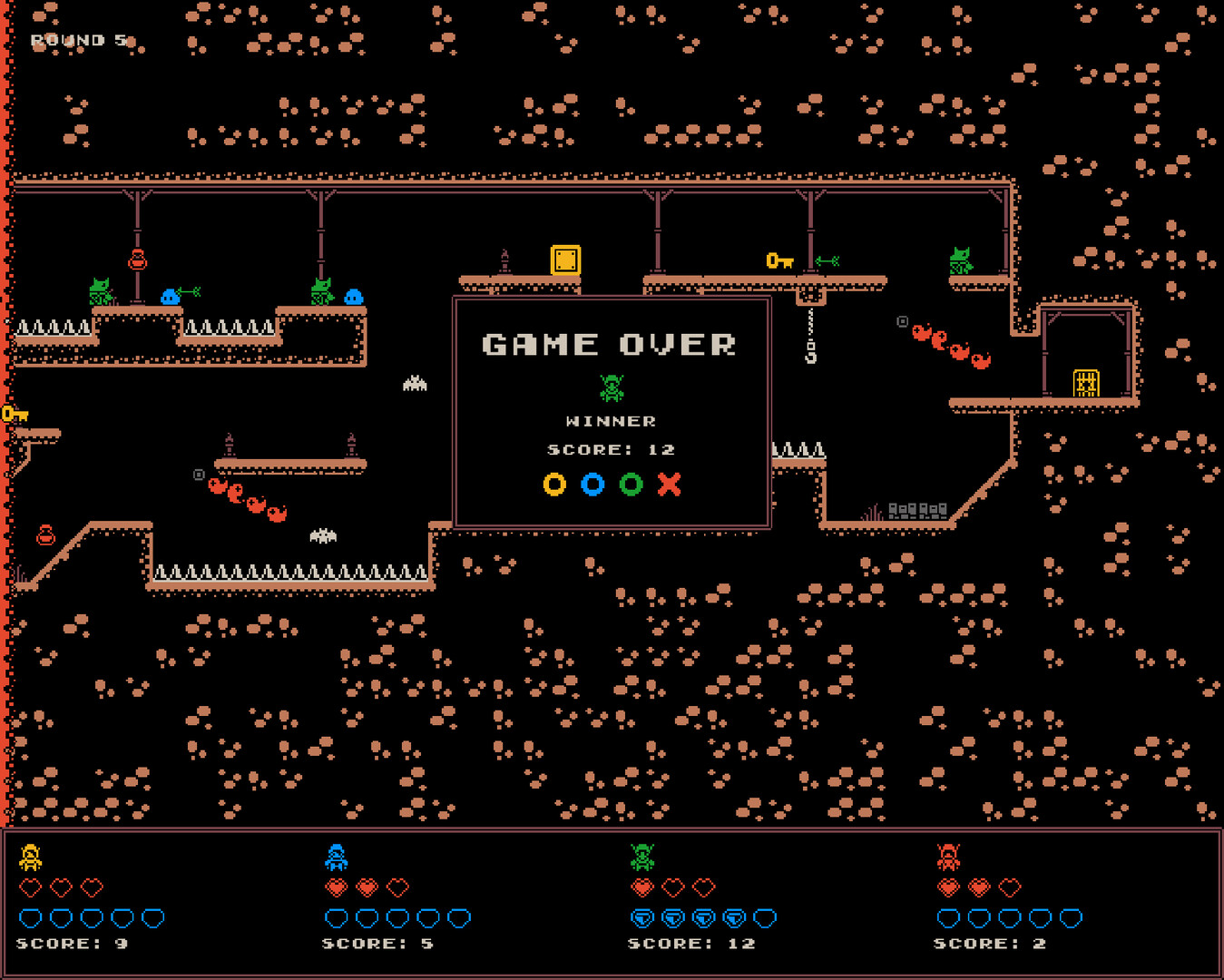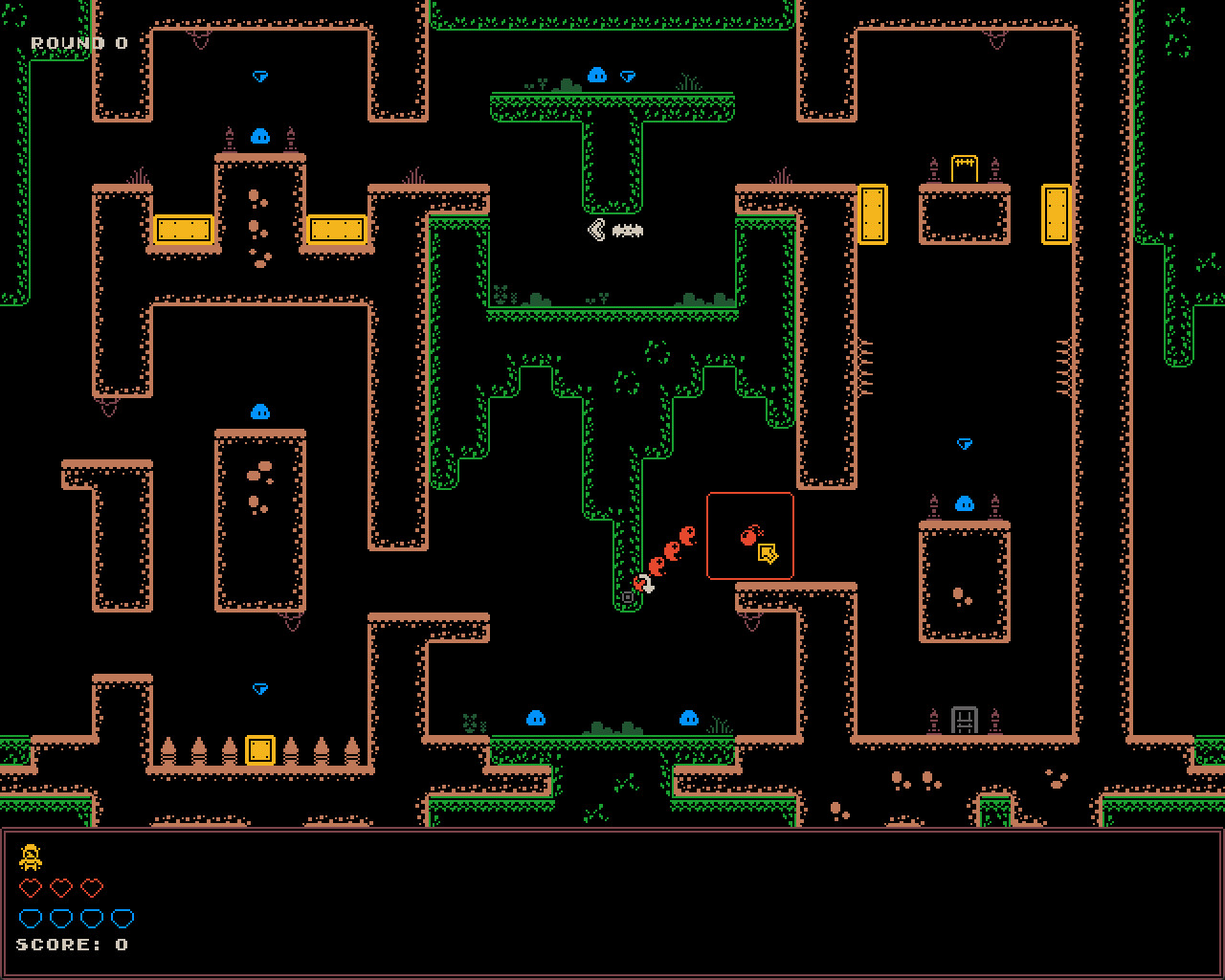 Rogue Raiders is a multiplayer action platformer. Jump through dungeons while collecting loot and avoiding monsters and traps. Each round starts with the players placing down traps, monsters and equipment. Then you compete against each other by platforming and wall jumping through the dungeons, avoiding damage and collecting loot. The winner is whoever takes less damage and collects most treasures.