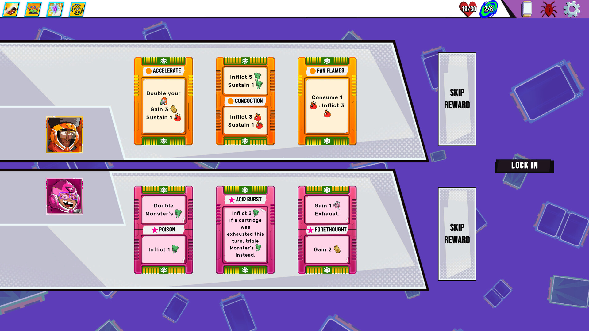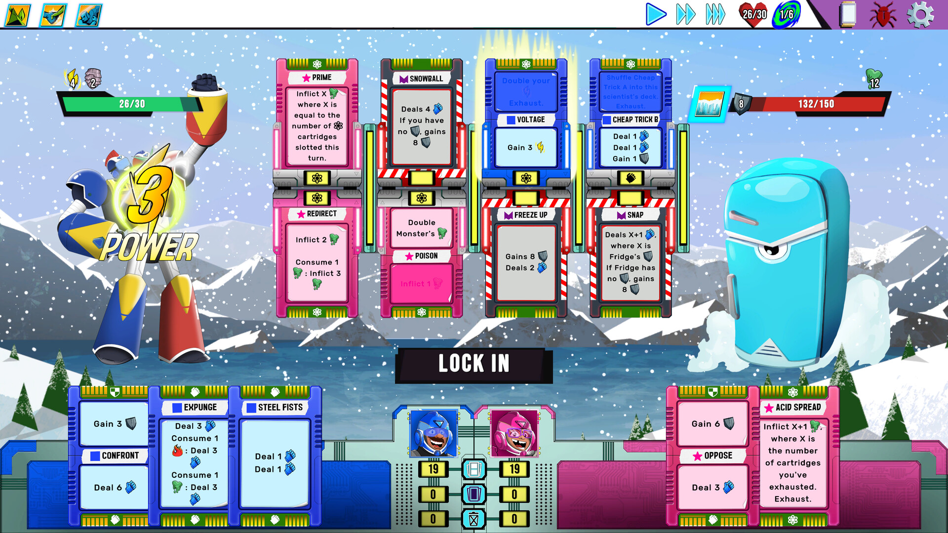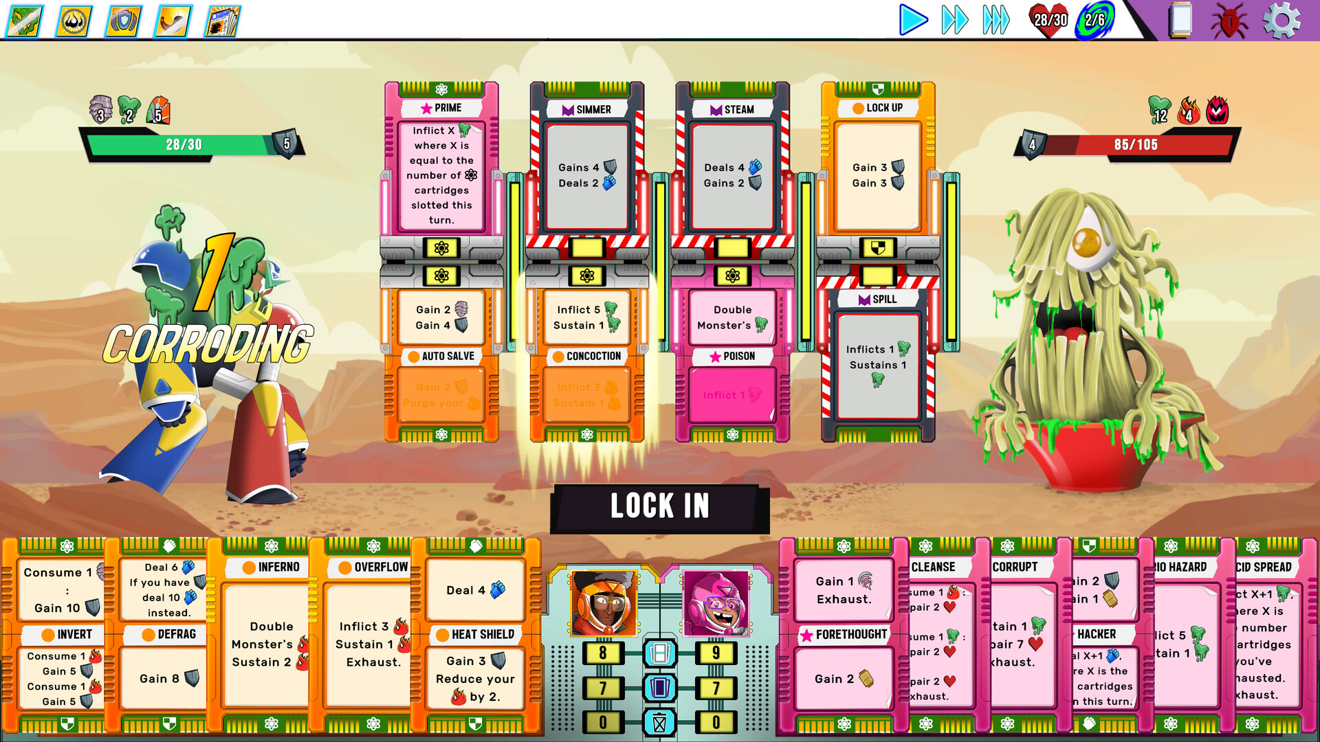 Super Supreme is armed with a predictive drive that displays the monster’s intentions. Plug your cartridges into the beat sequence, Lock In, and Super Supreme will execute the turn. Playing cartridges is free, it’s the order that determines whether you’re the hero standing tall as a skyscraper or you’ve got a monster-sized footprint on your chest.