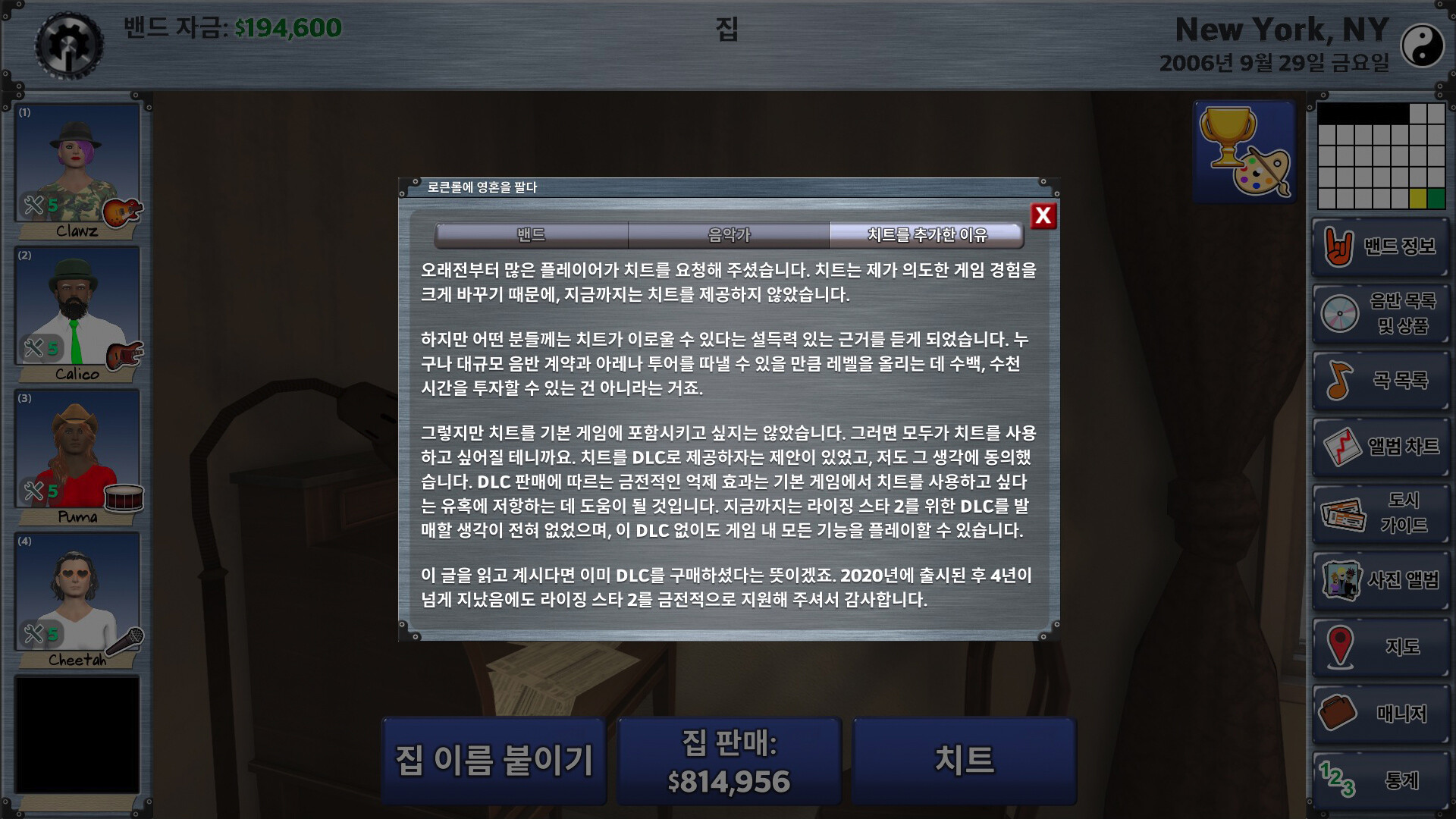이 DLC를 구매하면 치트를 사용해 정상에 오를 수 있습니다. 치트는 집에 있는 책상으로 이용할 수 있습니다. 반복 작업이 싫으신가요? 그렇다면 이 DLC가 마음에 드실 겁니다.