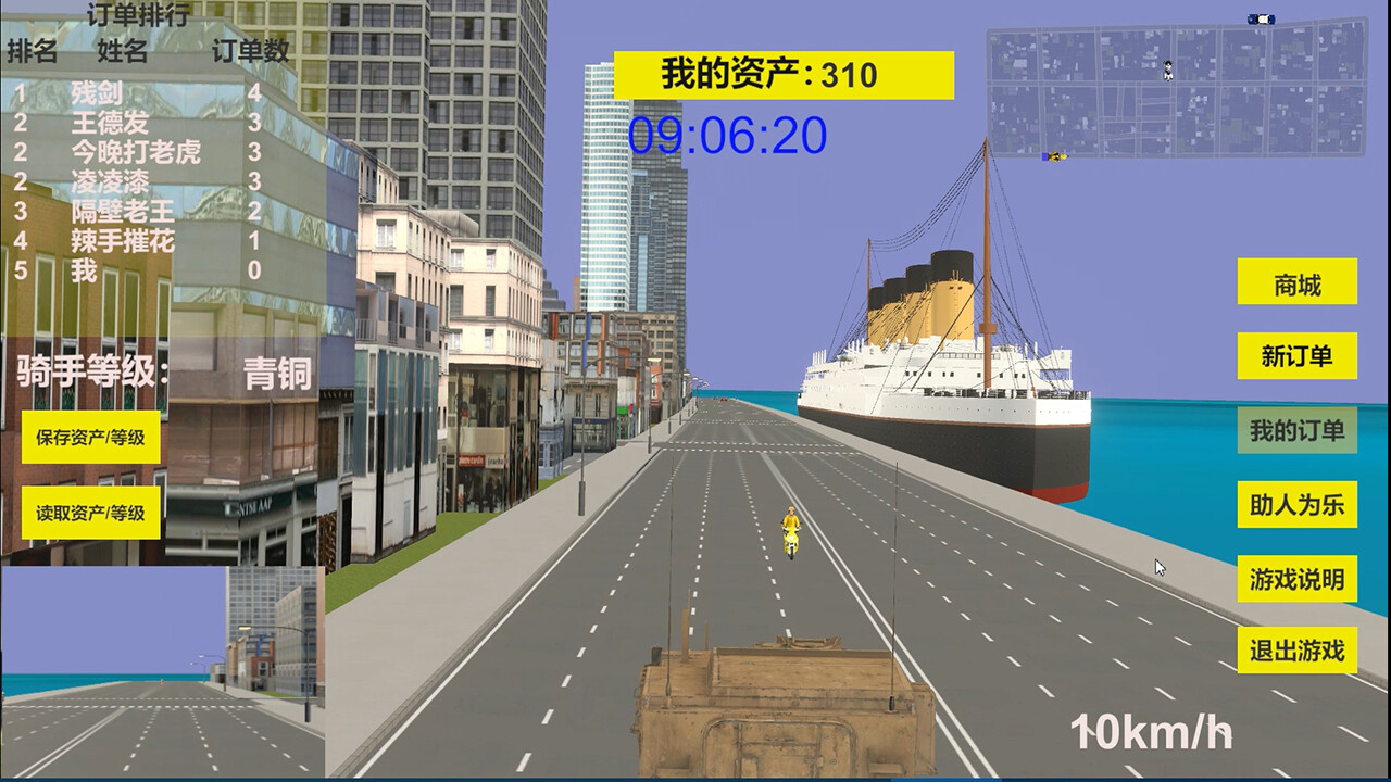 这是一款模拟送外卖的独立开发游戏。在送外卖的过程中需要避开行人和车辆。游戏中有白天、黑夜、下雨等各种场景。 也可以体验使用不同交通工具进行送外卖,感受同行之间的竞争,也可以在游戏里面购买彩票碰碰运气。成为单王则能获得丰厚的奖励。当然,在送外卖途中如果闯红灯或者超速就会触发警察的追捕。