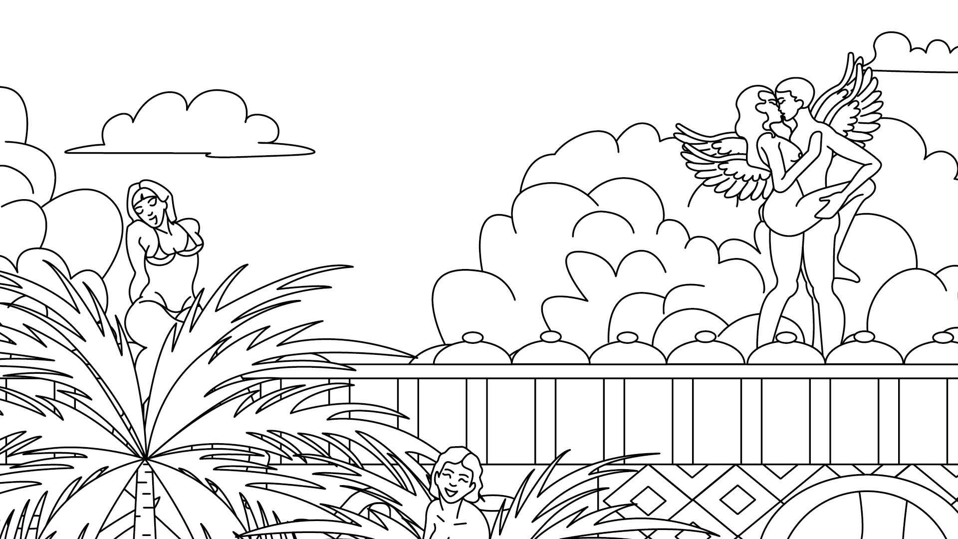 The game contains a large amount of exposed female breasts and lots of couples in suggestive poses. No genitals are depicted.