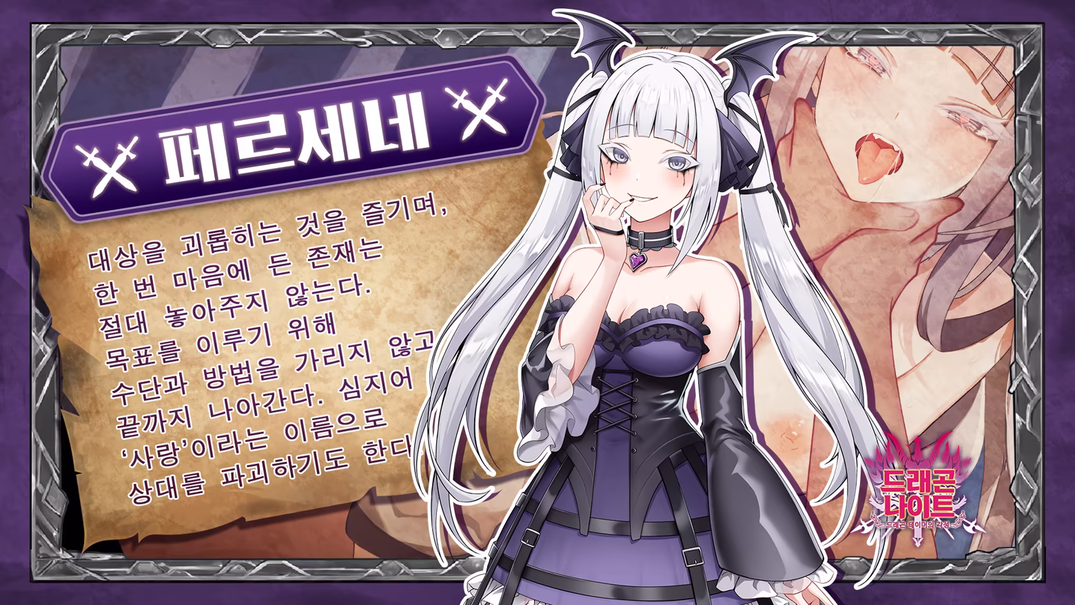 《드래곤 나이트 - 드래곤 테이머의 각성》은 로그라이트와 탑다운 방식의 슈팅 게임입니다. 각 스테이지에서 점차 강해지는 적들을 물리치고, 동시에 레벨을 올려 마법을 획득하세요. 최종적으로 8분 때에 나타나는 스테이지의 최종 보스에 도전해야합니다. 도전에 실패하더라도 게임 외부에서 드래곤 레이디를 강화하여 더욱 강력한 모습으로 계속 도전할 수 있습니다.