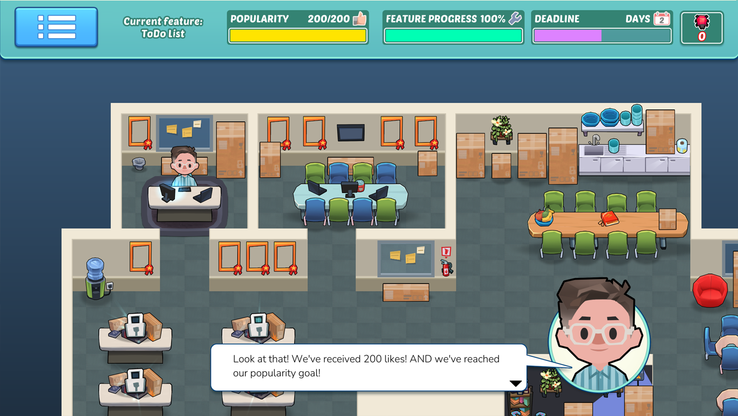 Manage your development house, keep your employees happy and squash bugs as they come up in this minigame filled, top down management and strategy game! Starting from a single programmer, you'll select features to develop for your game engine, buy new furniture for the office to improve the performance of your team, hire new developers, and collect posters for the office!