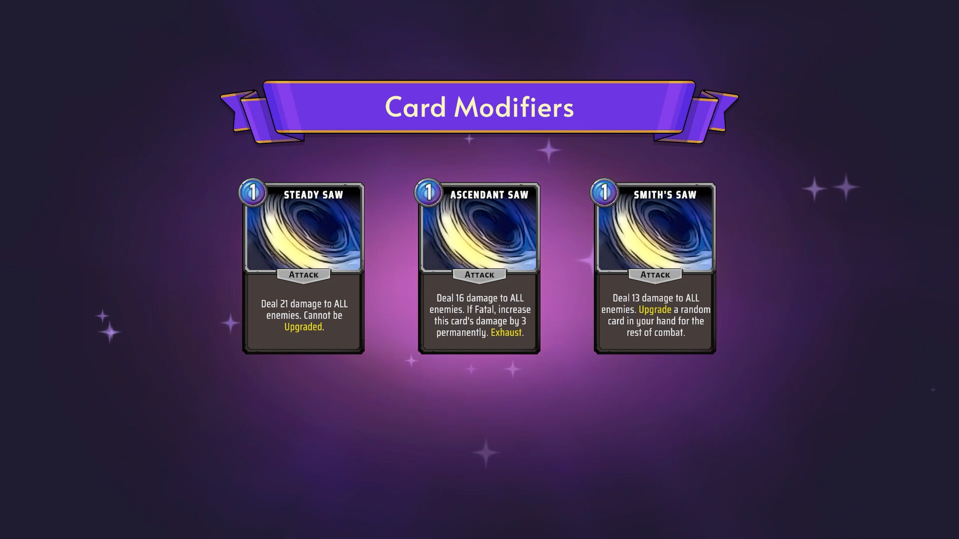 Forget repetitive card plays! Our Card Modifiers feature adds exciting new dimensions to your runs. Instead of encountering the same "Cleave" repeatedly, you might find a "Limitless Cleave" that can be upgraded infinitely, or a "Mega Cleave" that costs more energy but deals massive damage.