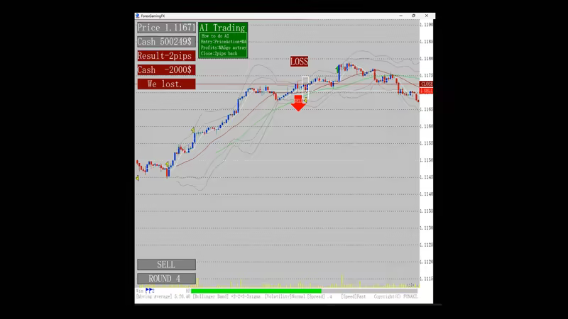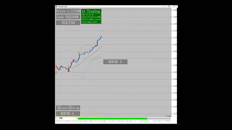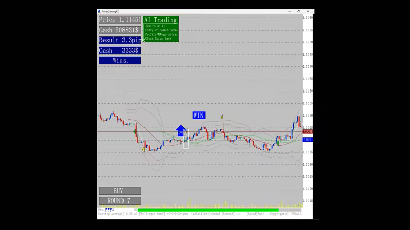 The charts display buy and sell signs, allowing even beginners to practice with confidence. Charts can be displayed at up to 500x speed, allowing for efficient training in a short period of time. In addition, an evaluation function for trading performance is provided, allowing users to objectively analyze their own trading skills. The default settings also allow you to change the spread, chart speed, and starting price. AI-based automated trading allows you to objectively learn and deepen your understanding of your trading methods.