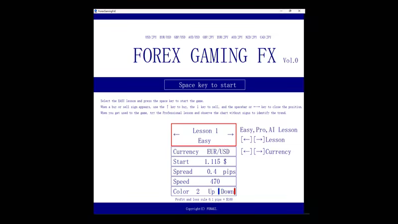 First, select the Beginner Course to start the game. Press the space key on the title screen to start the game. The chart will appear and begin to move. When a buy or sell sign appears, follow the sign to make a trade. To trade, press the up key to buy or the down key to sell. To close a position, press the space key or the ←→ keys.