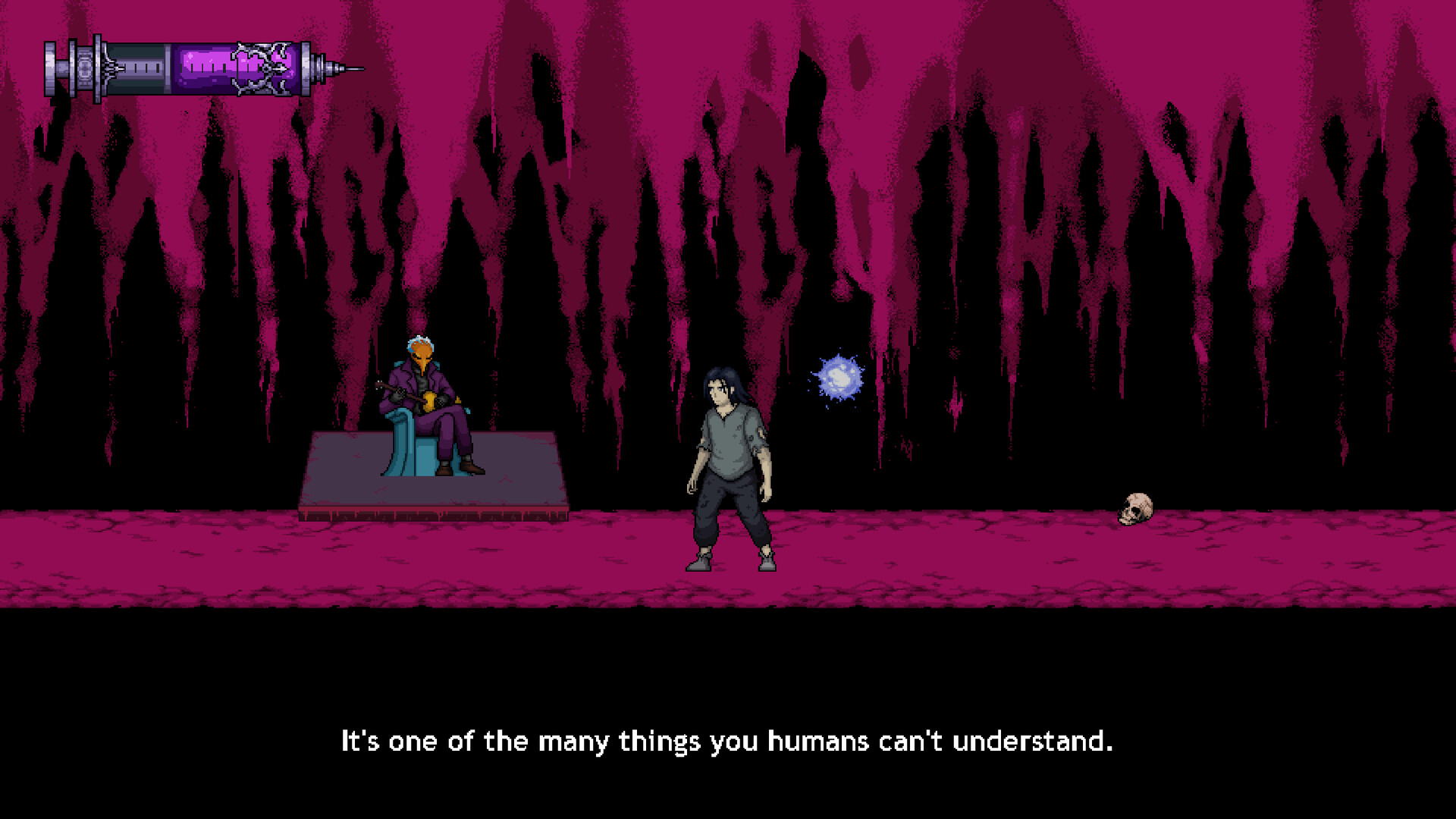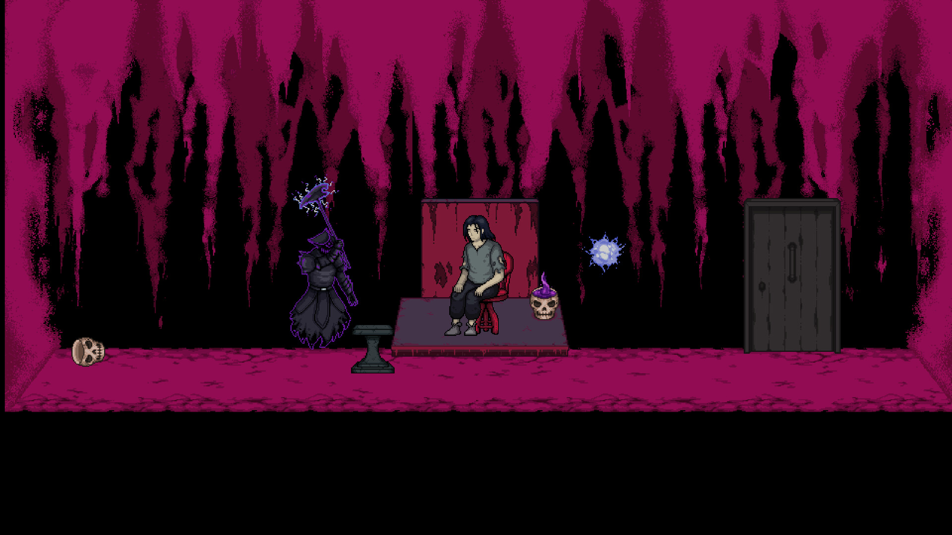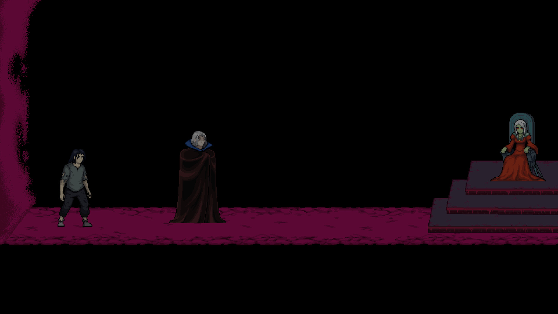 Phantompunk is a 2D, story-driven, side-scroller game. The game takes place in a dark sinister setting where the player can navigate the environment and interact with other characters to progress through the story.